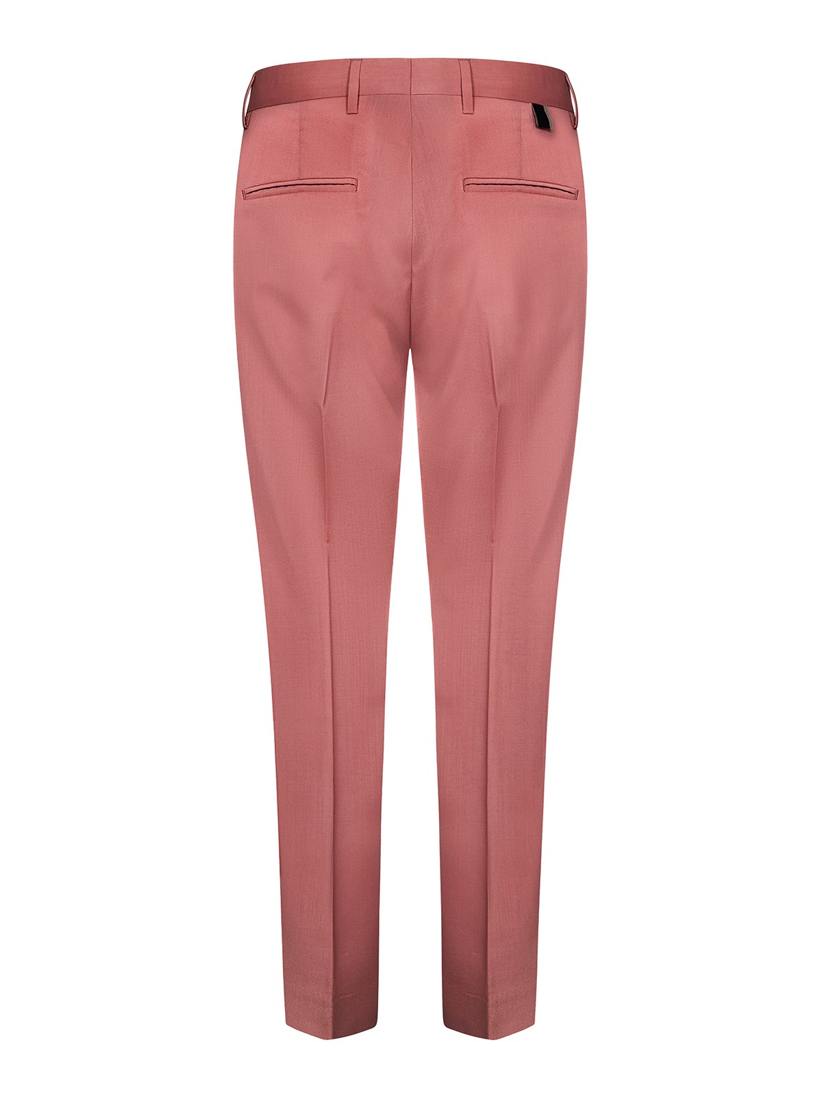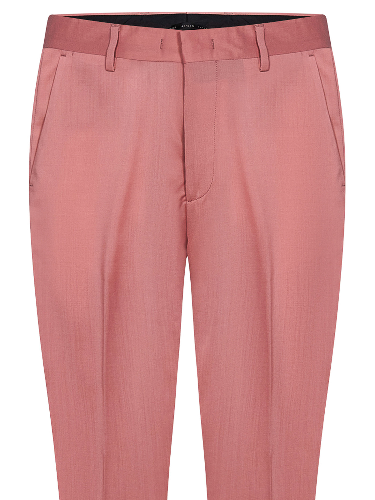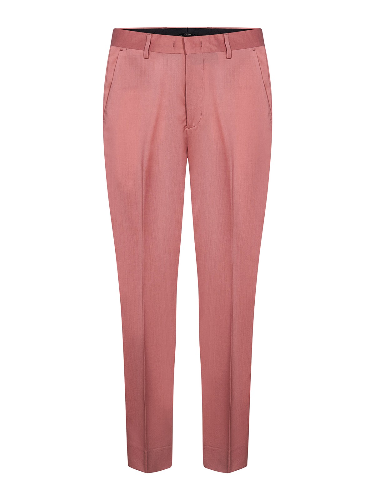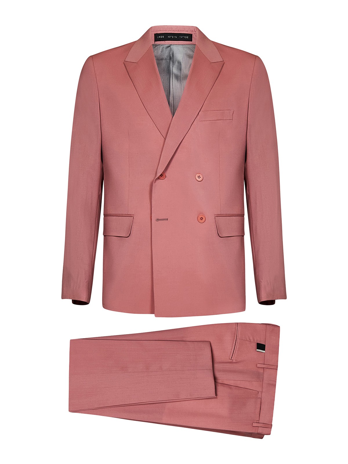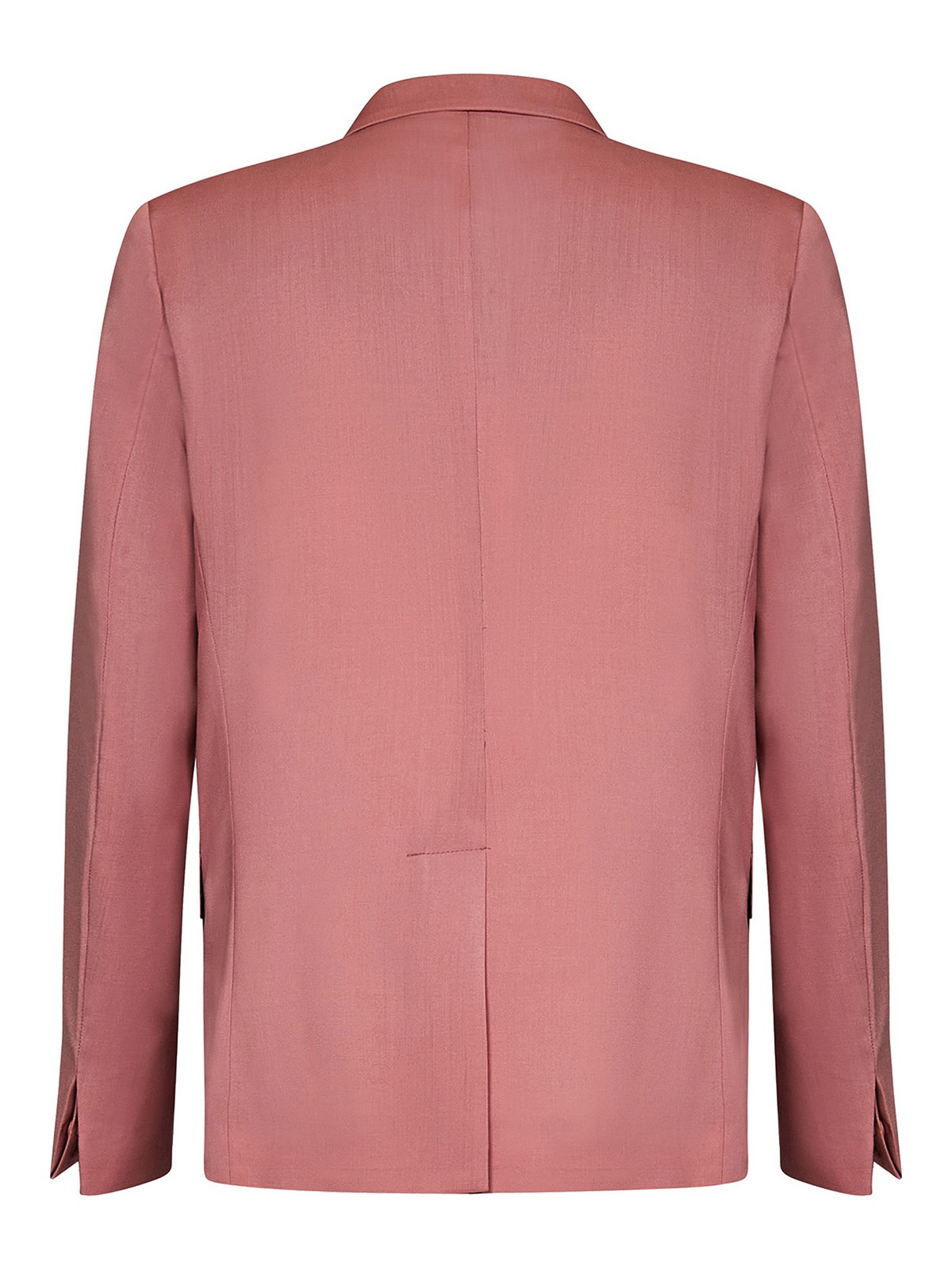 ブレザーダブルブレストフロント4ボタンクロージャーノッチラペルロングスリーブストラクチャードショルダー隠しワンボタンカフスフロントウェルトポケットフラップ付きチェストポケットセンターバックスリット一部裏地付きパンツフロントカバージップフライとフッククロージャーベルトループバックサイドにツートンカラーのグログランプルタブスラッシュポケットセンターフロントとセンターバックの折り目付きスリムレッグピーチピンクのウールアイテムは