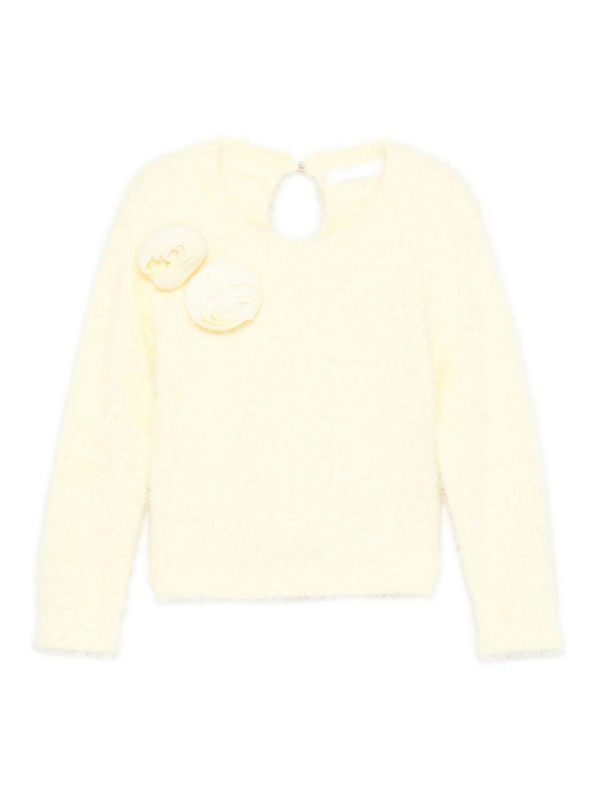 胸元に花をあしらったプルオーバー、後ろに開口部