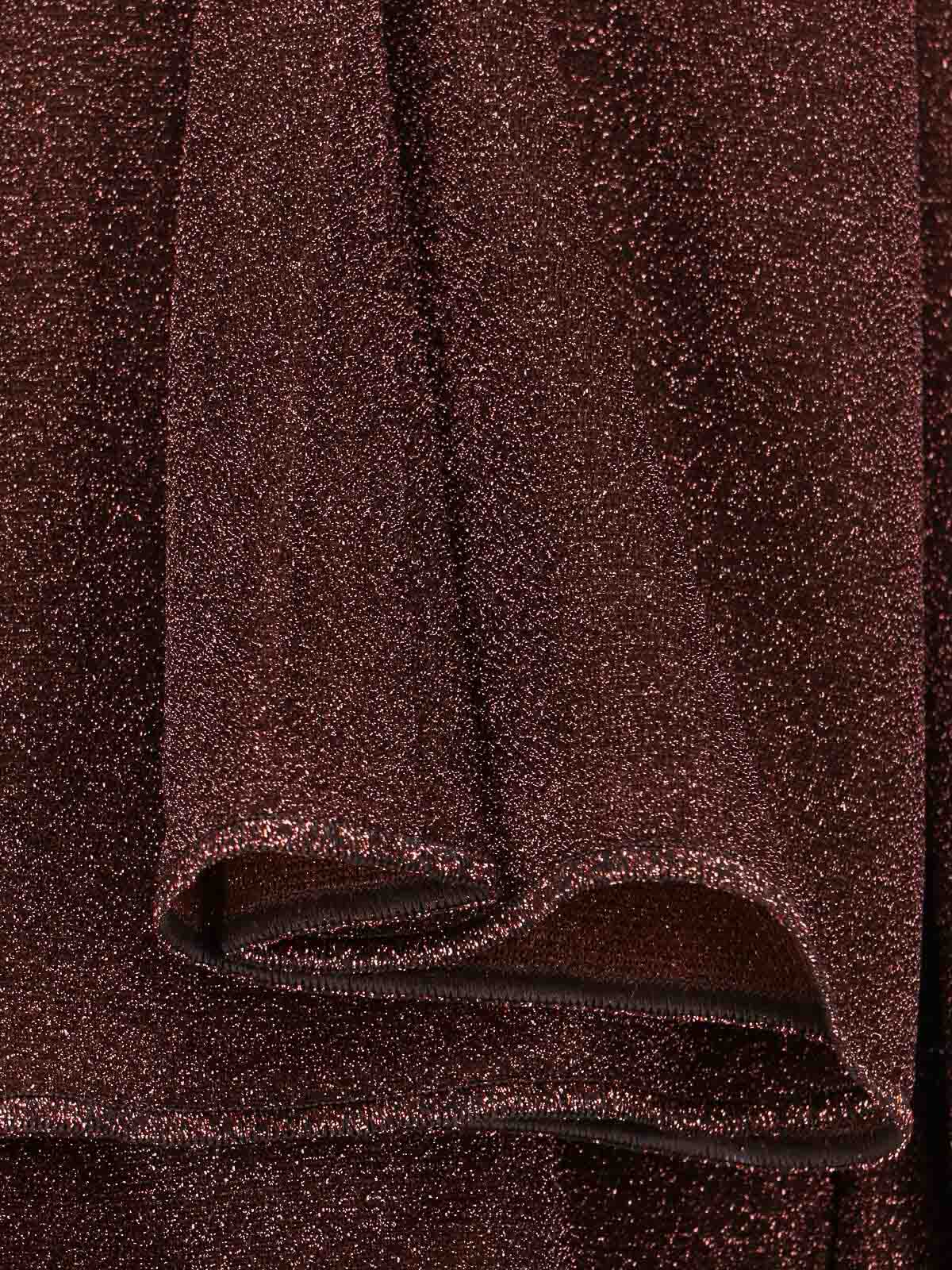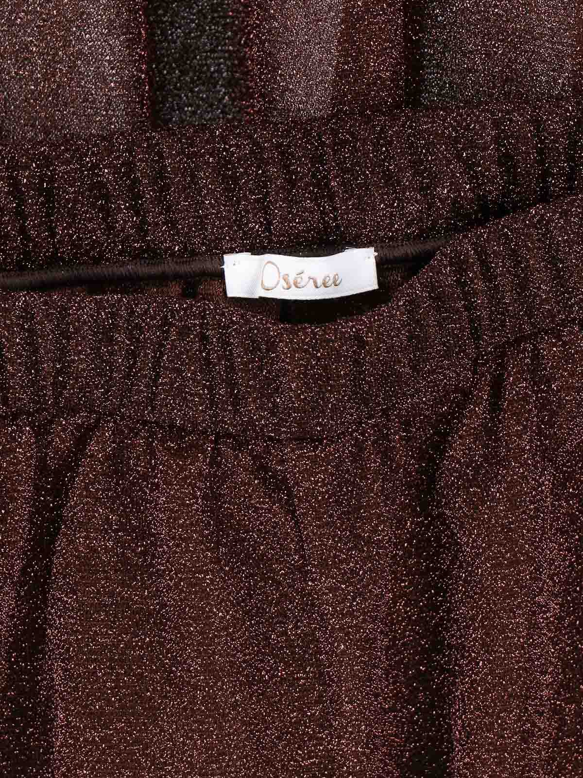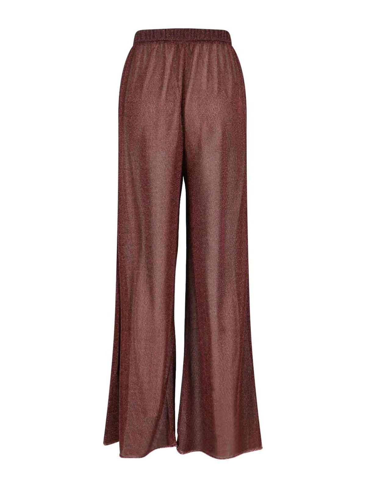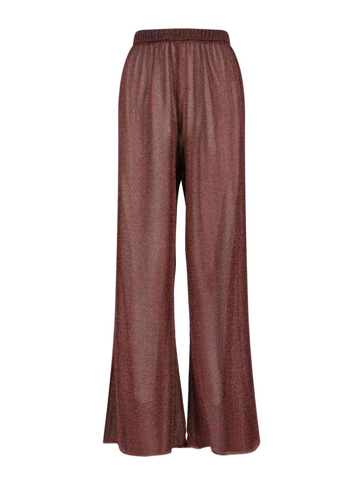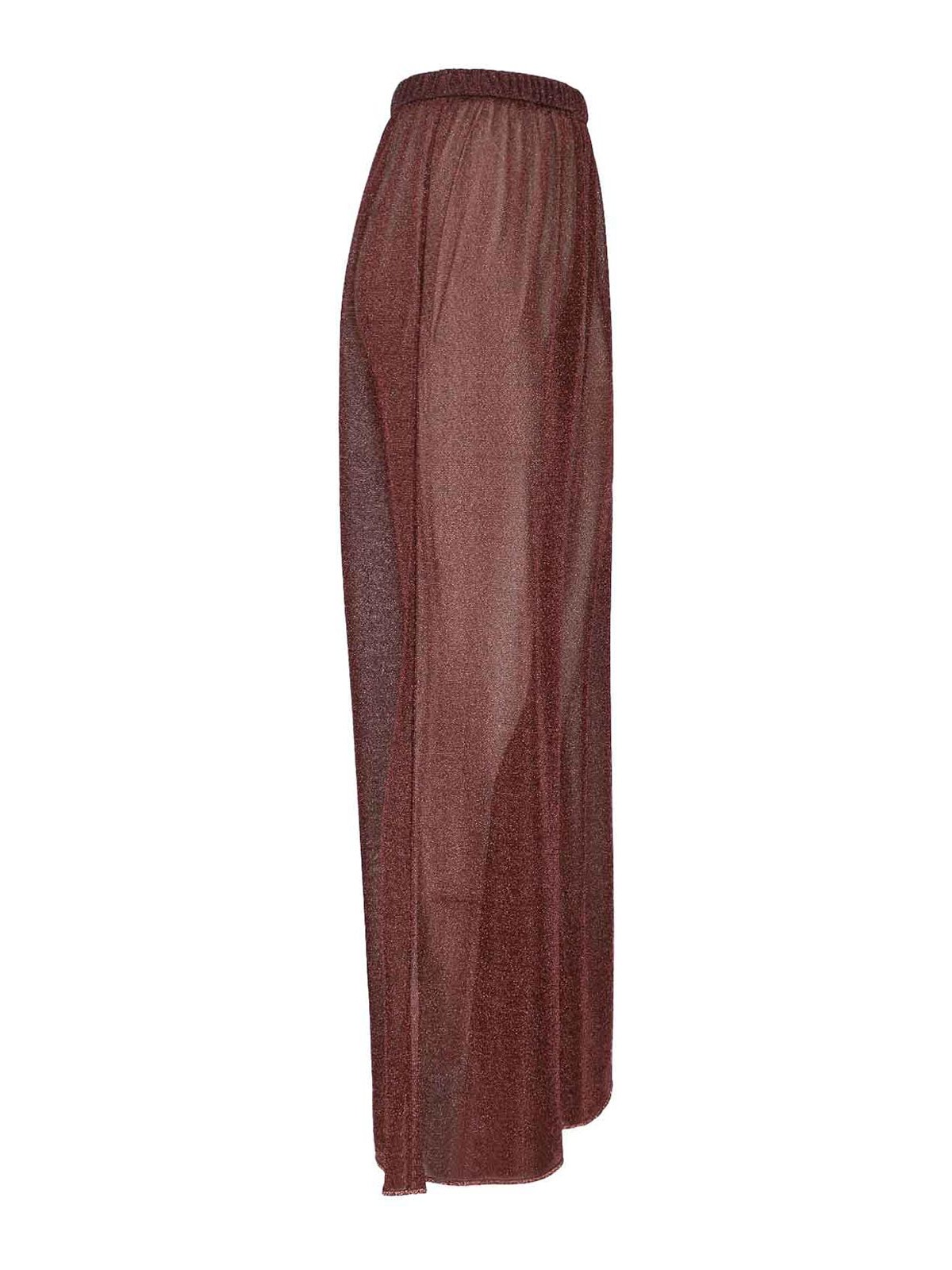 半透明のメタリックブラウン生地を使用したOseree lumireパンツ、ウエストゴム入り、ウエストにギャザー付き、ワイドレッグ。
