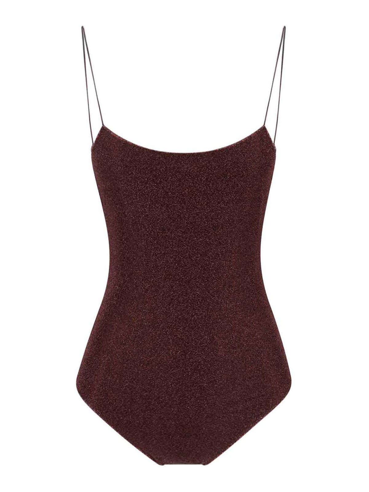 ブラウンメタリック生地のOseree lumireワンピース水着、細いストラップ、バックネックライン、バックレースクロージャー、クラシックスリップ、調節可能なレース、ロゴポーチ1つ。