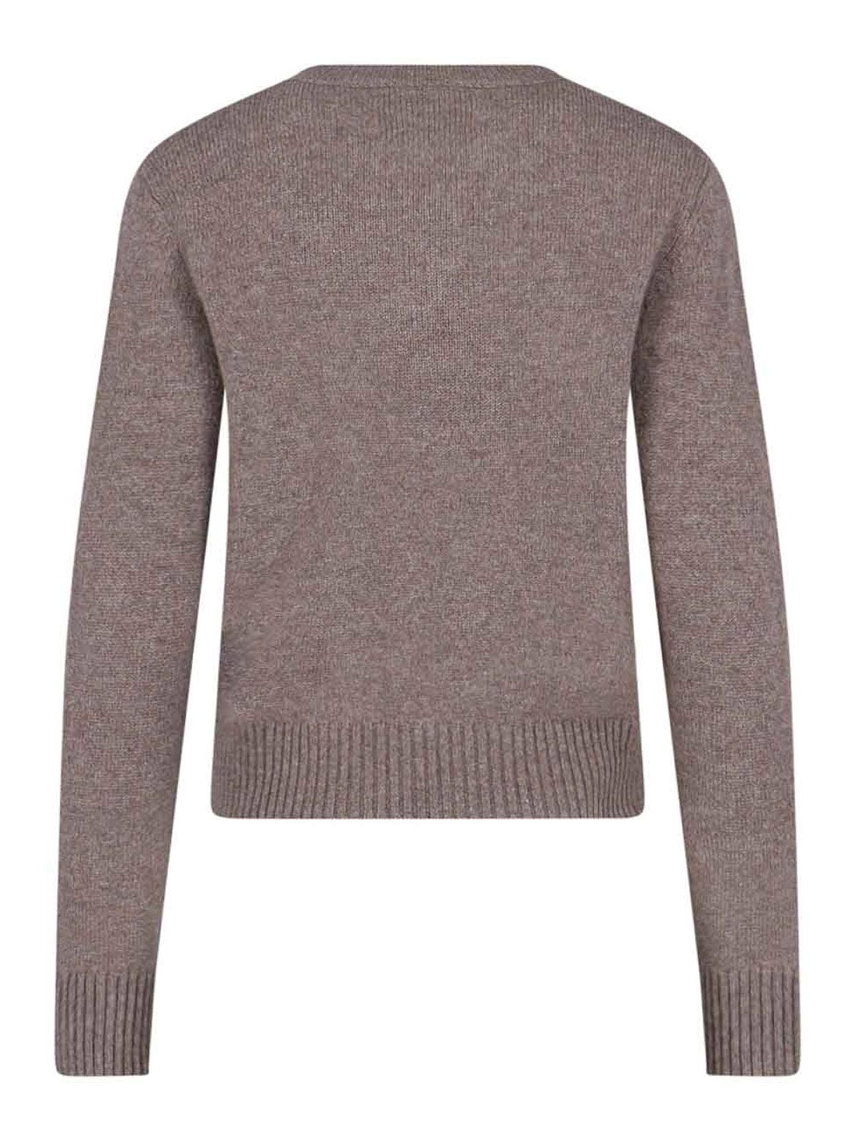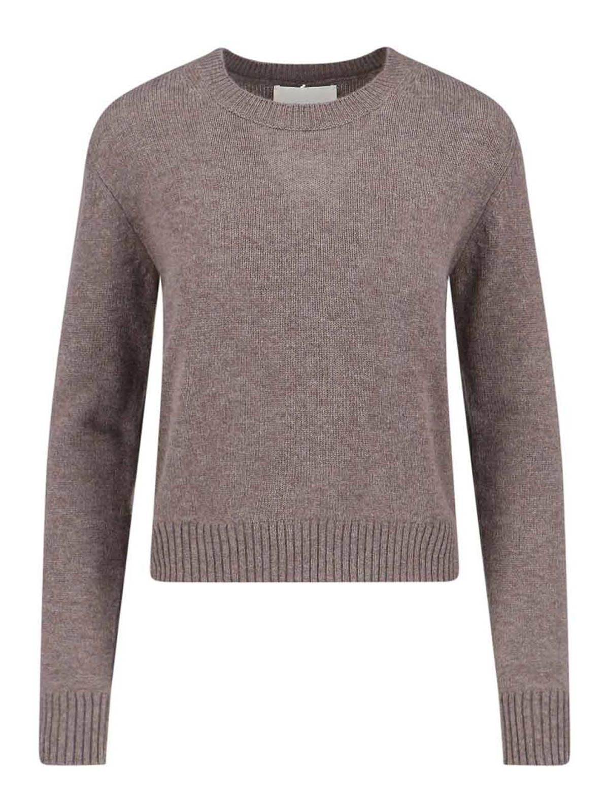 マーブルリサヤンセーター、ブラウンカシミア、ニット、クルーネック、リブ仕上げ、ドロップショルダー、ストレートヘム。