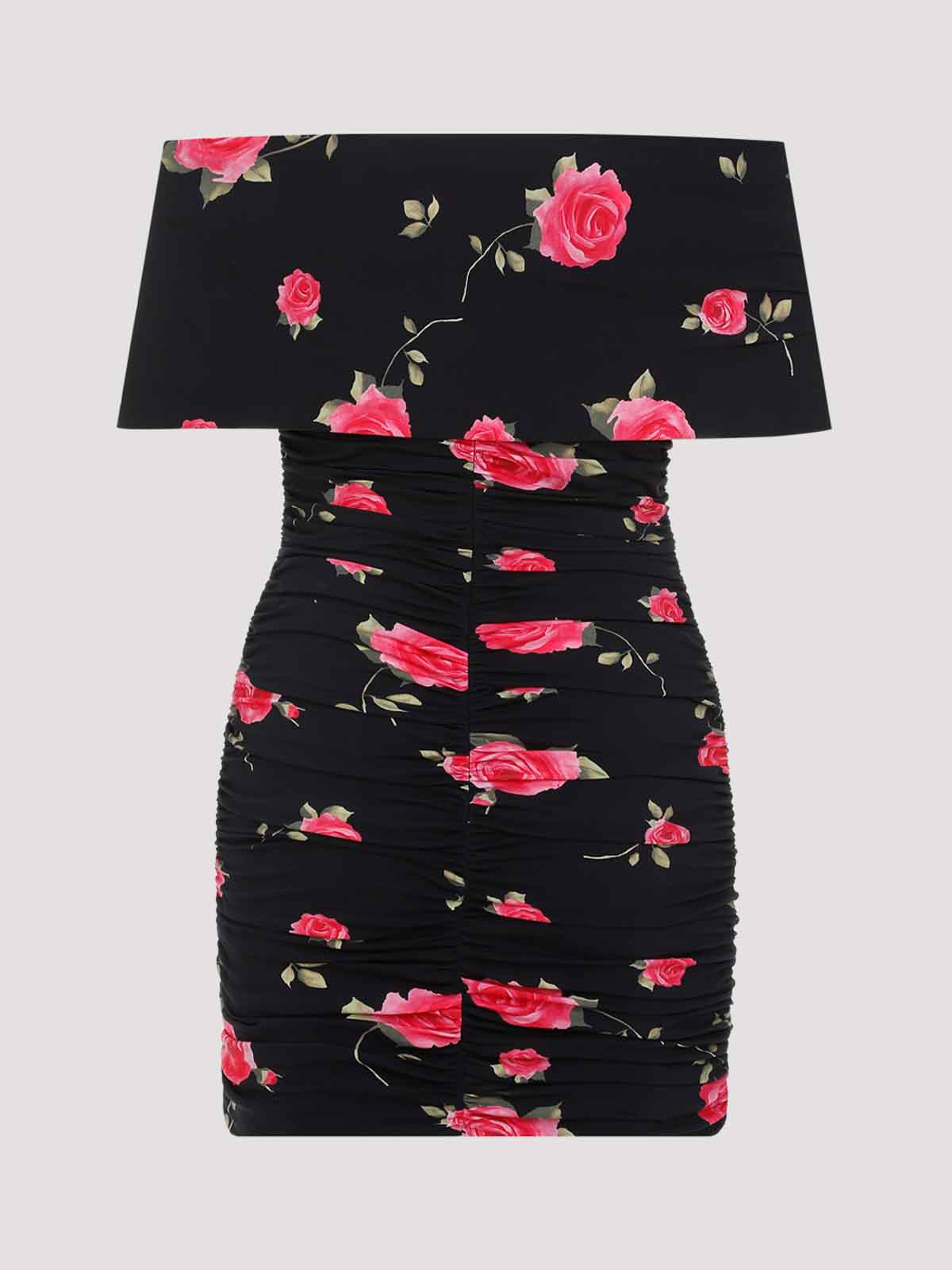 Magda butrym ブラックプリントドレス。ポリアミドとエラステインのブレンドで作られています。深いVネック、オフショルダーシェイプ、腕周りのラップ効果、全体にフリル効果、バックジッパー留め、ミニレングス、ストレートヘム。