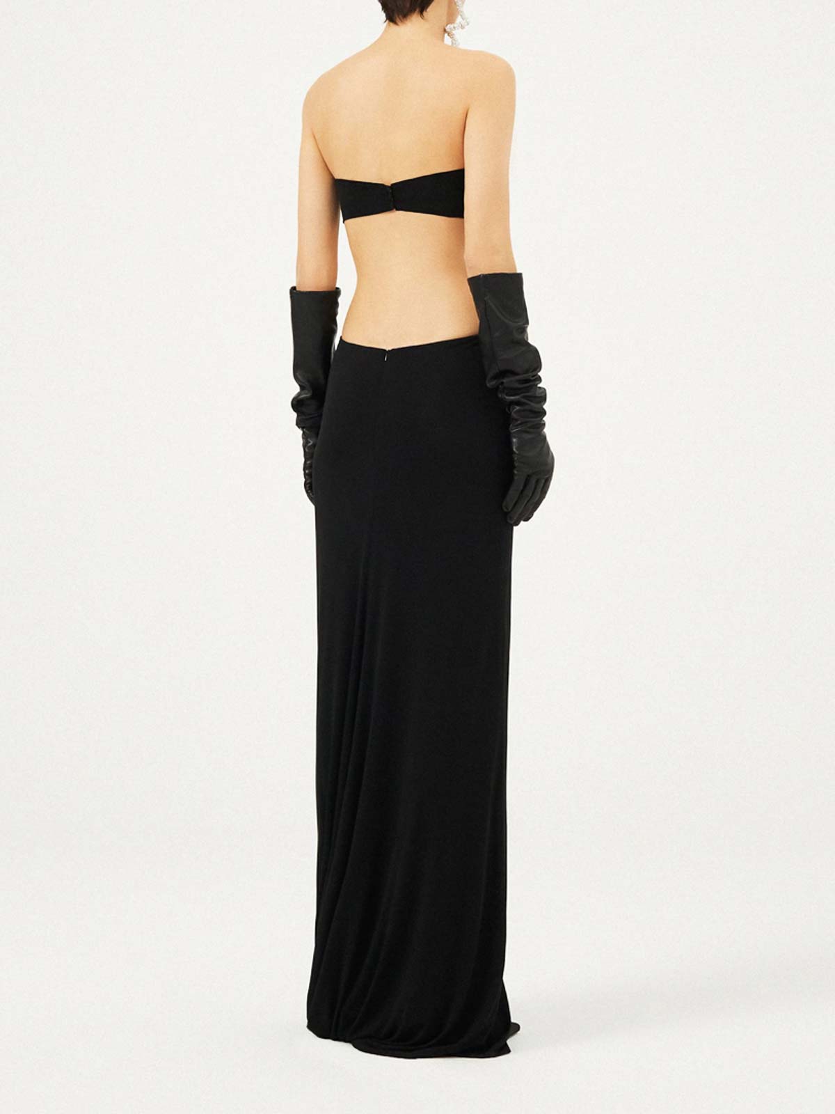 このドレスは、コントラストレッドのバラのアップリケで留められたスカートとトップスのようにデザインされています。シルエットは、露出した腹部とマキシ丈のスカートが強調されています。