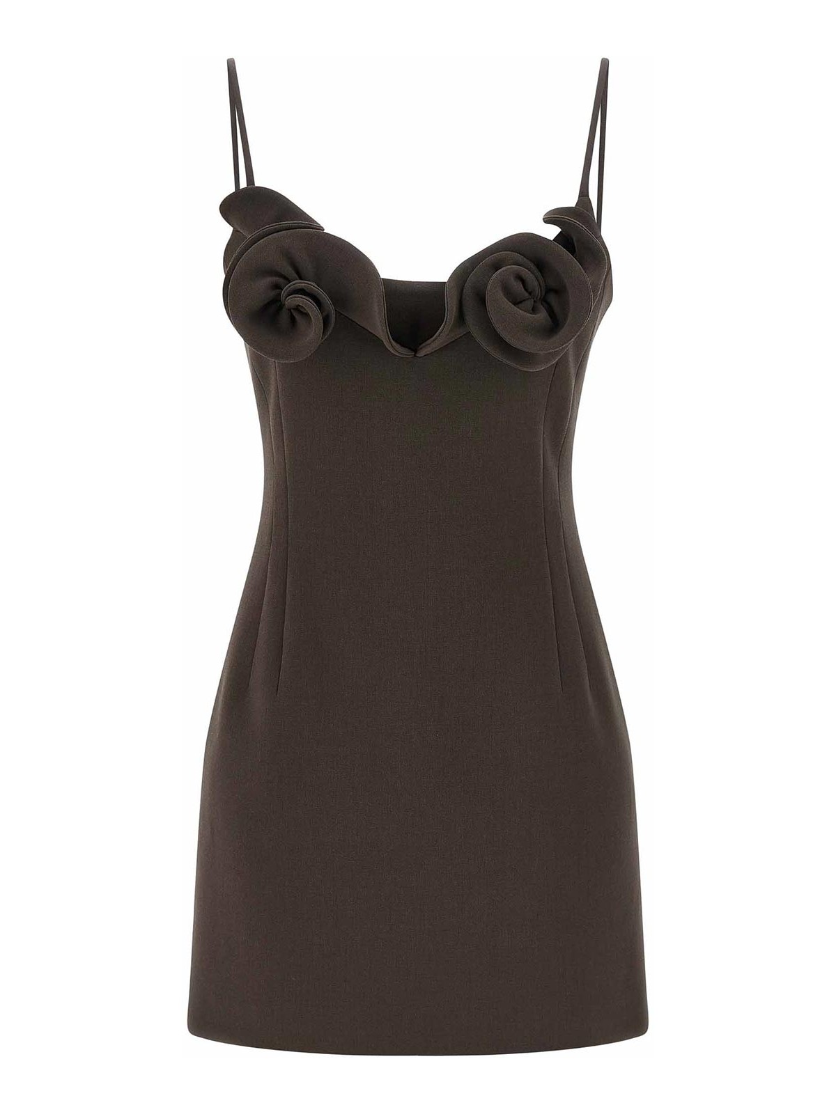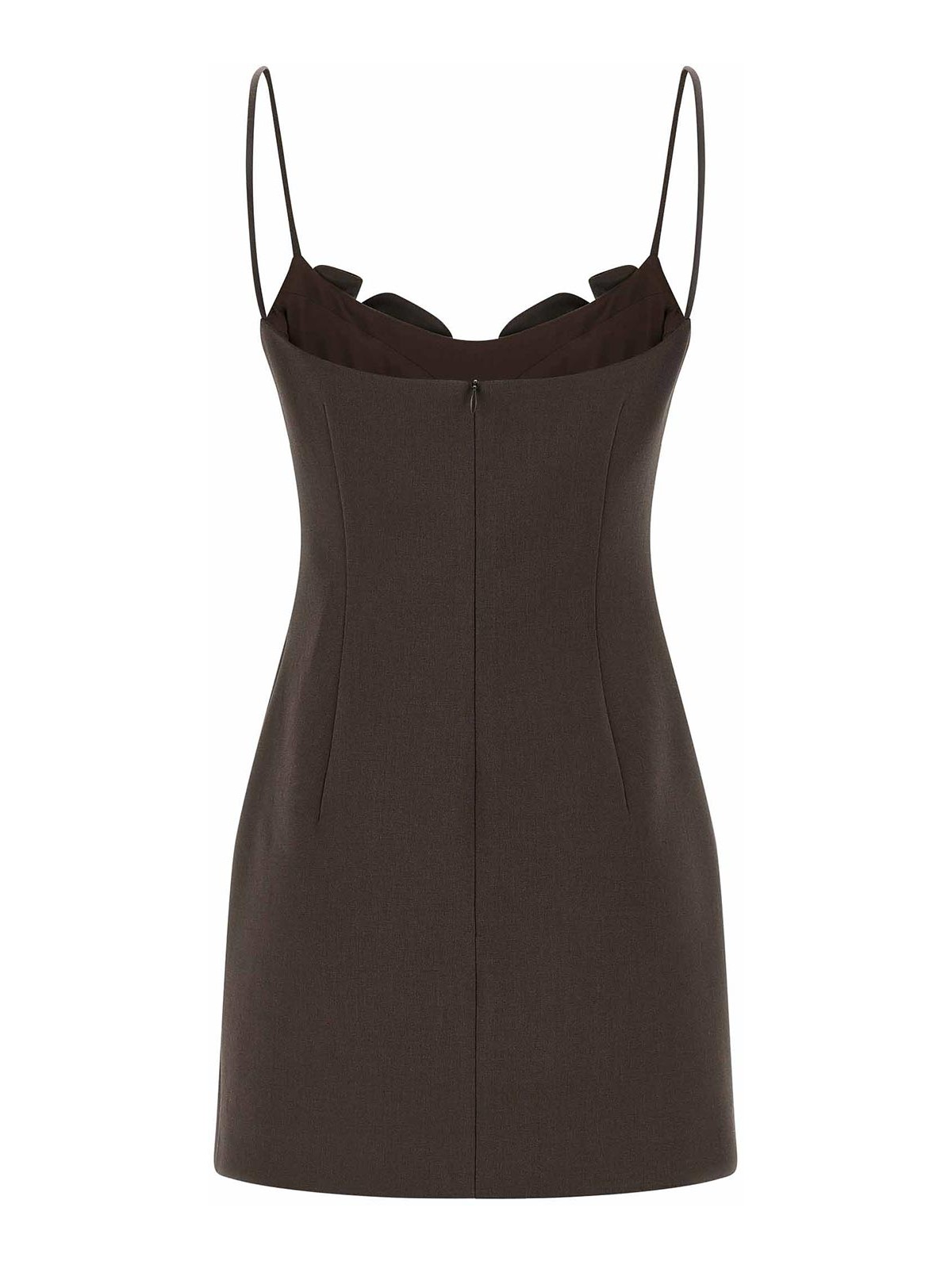 やや伸縮性のあるウール混紡素材のミニ「ドレス38」ドレス。前面と背面にプリーツをあしらったフレア、細いストラップ、前面には彫刻的なディテール、背面には隠しジッパー付き。