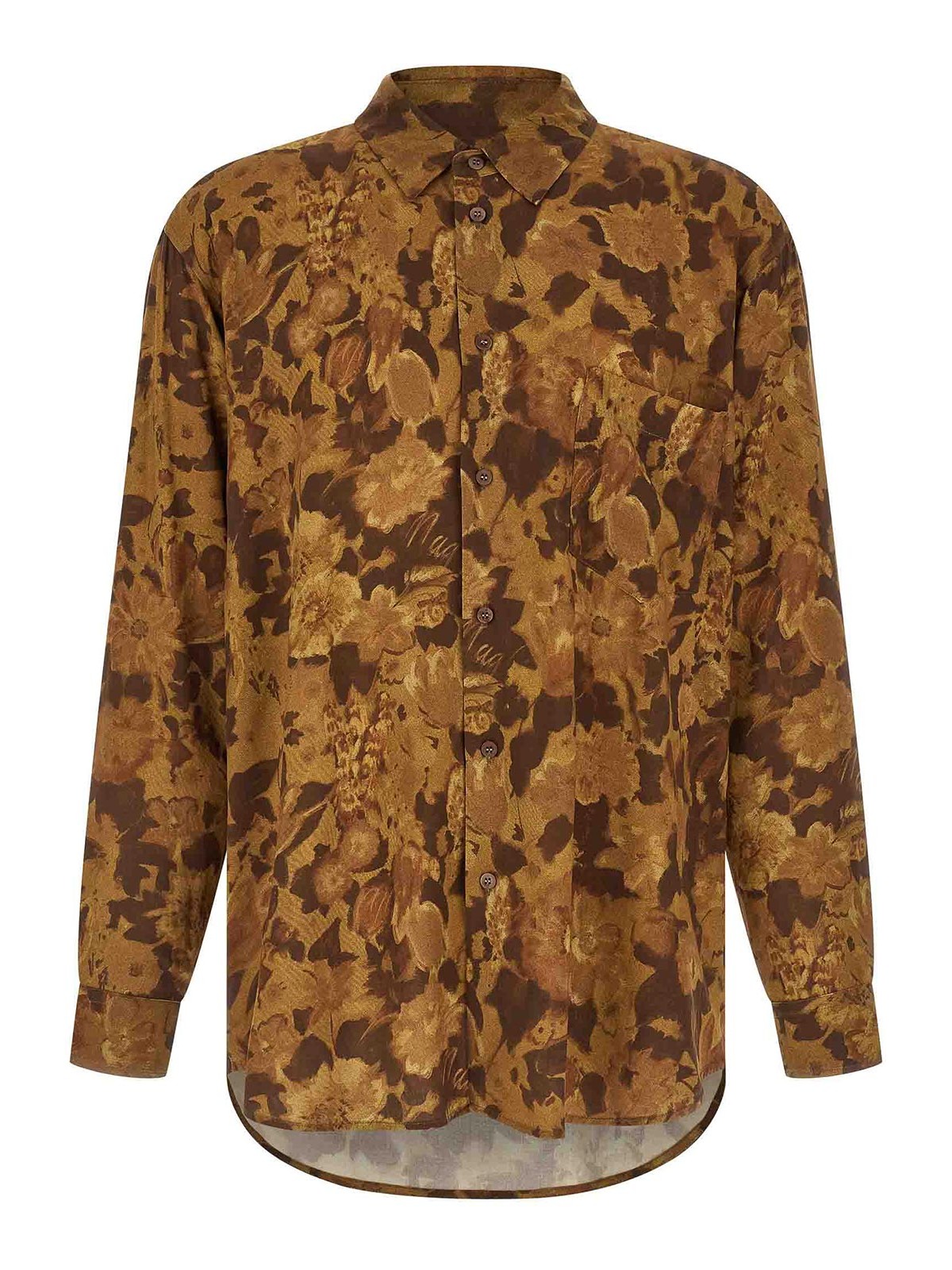 全面に「ドライフラワー」プリントを施した軽量ビスコースプリントシャツ。胸ポケット、フロントボタン留め、袖口とドロップショルダー付きのロングスリーブ、アシンメトリーなヘム。