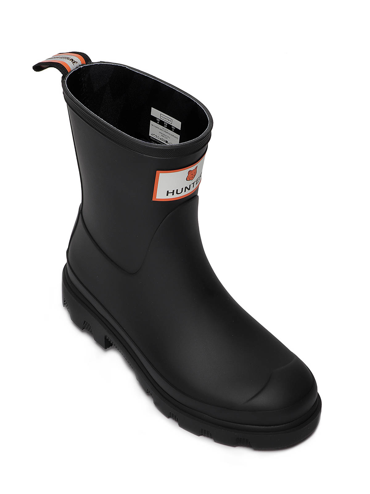 フロントラベルとリアタング付きのローブラックラバーブーツ、ローソール、防雨。