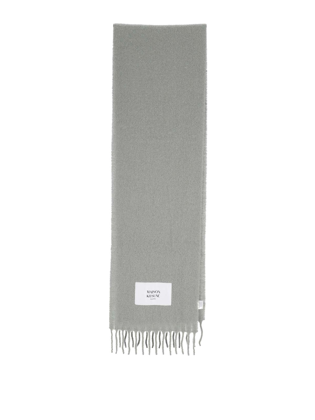 メゾンキツネアルパカブレンドのスカーフ、グリーン、長方形のデザイン、前面にロゴラベルの刺繍、下部にフリンジ。