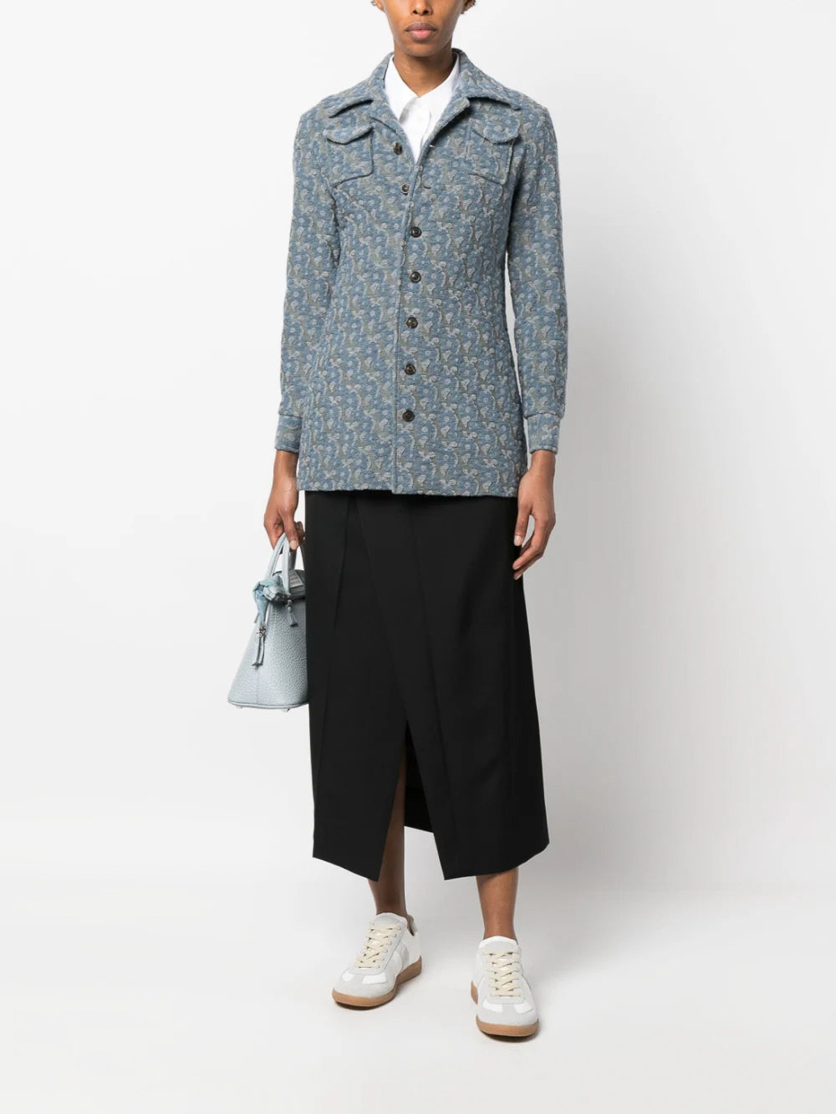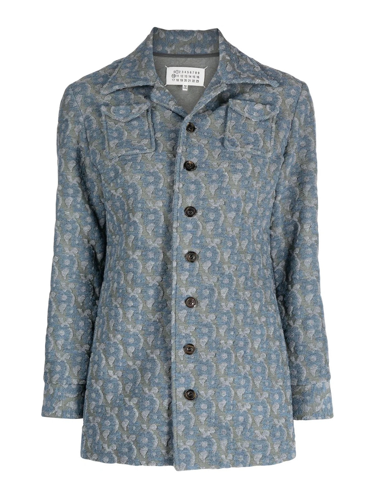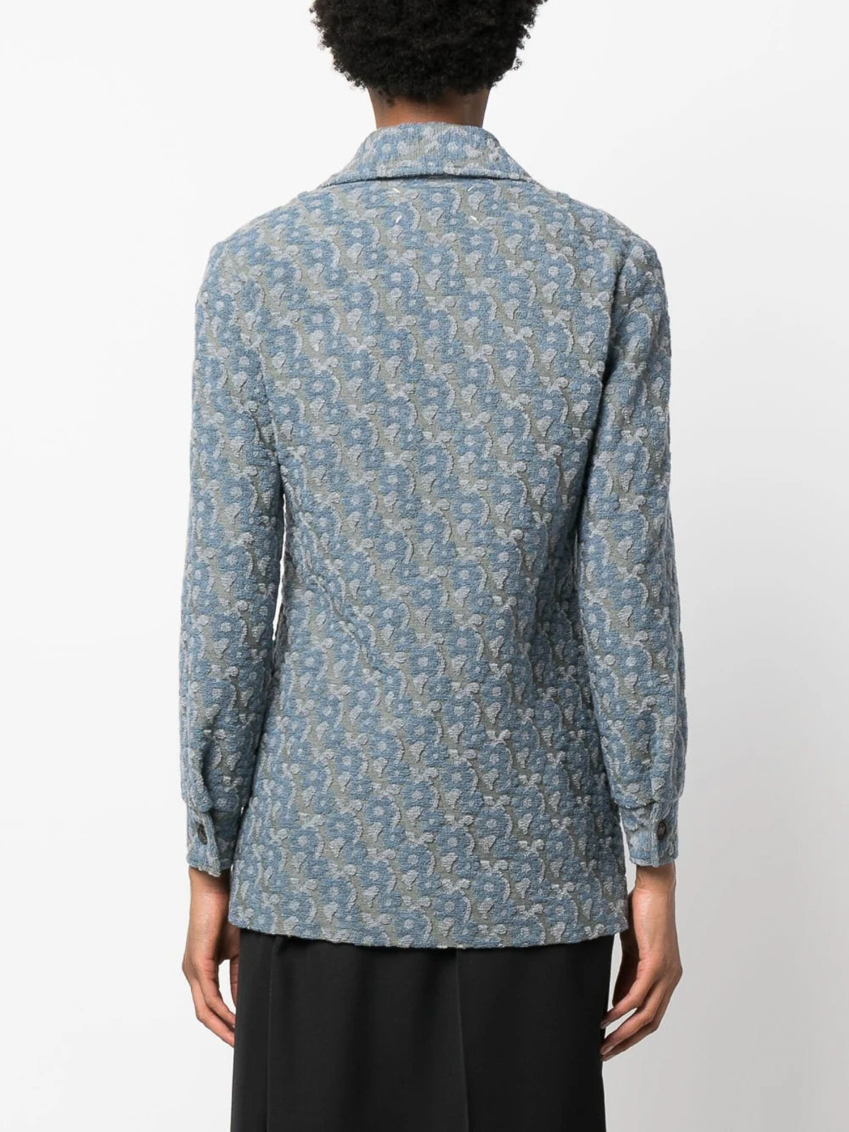 ブルーグレーウール混紡柄ジャカードカッタウェイカラーフロントボタン留め長袖ボタン付きカフスストレートヘム胸フラップポケット2つ