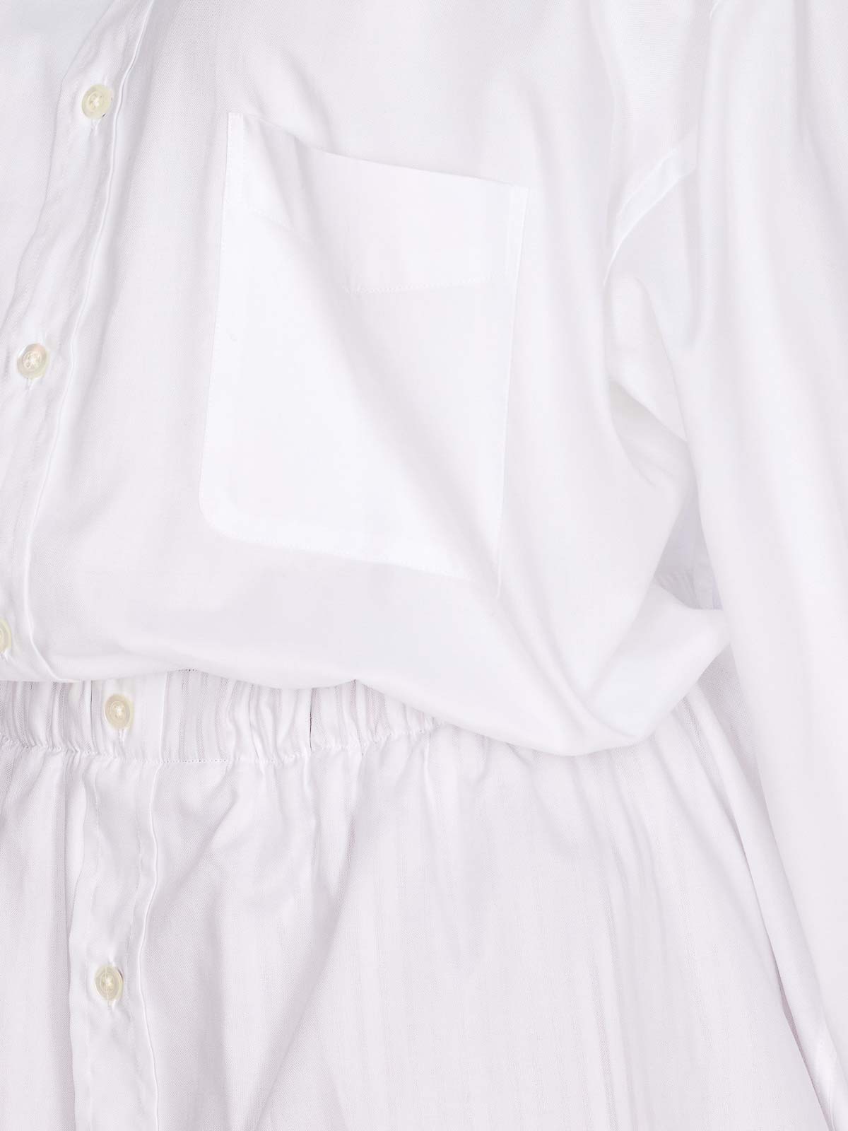 Maison margiela ホワイトシャツジャンプスーツ、フロントボタン留め、長袖、袖口にボタン、ストライプのディテール、ウエストにゴム入り