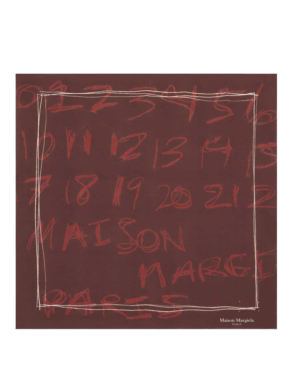 maison margielaによるブラウンのスクエアスカーフ。シグネチャーナンバープリントが特徴で、流行に左右されない洗練されたルックスです。