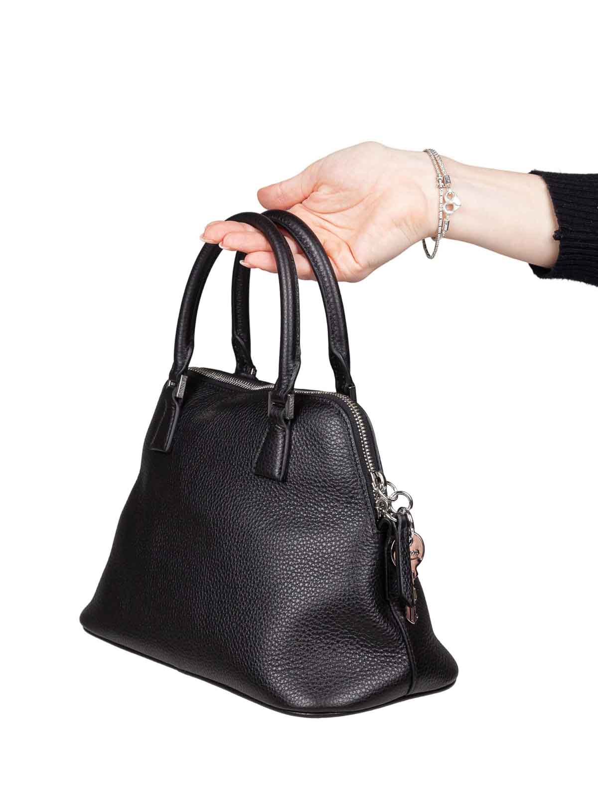 カーフスキンのハンドバッグ、取り外し可能で調節可能なジッパー付きトップハンドル、メタルフィート、背面に4つのステッチ、メタルコンポーネント、メタルコンポーネント
