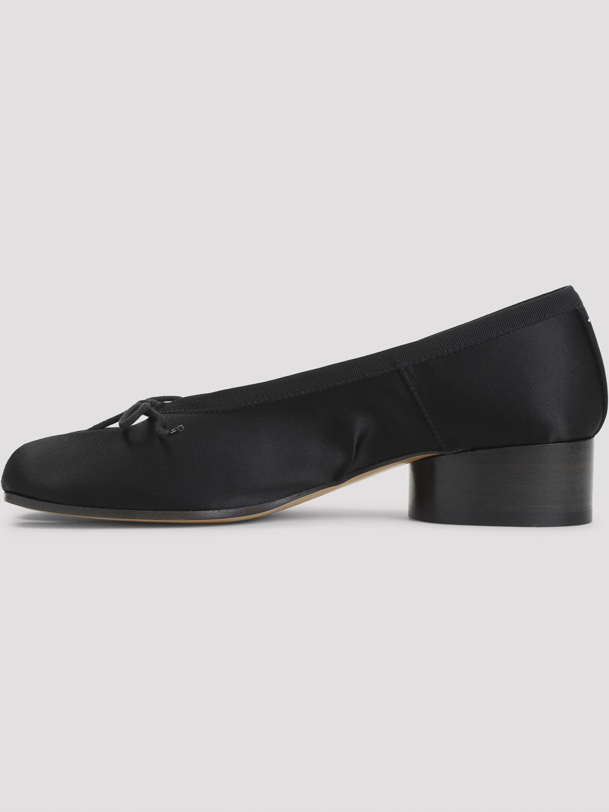 Maison margiela tabi h30 ブラックコットンバレリーナ。ブラックサテン製のヴァンプは、アイコニックなタビのトゥライン、グログランのトリム、フロントの細かいリボン、ブロックヒール、レザーの裏地、インソール、アウトソールが特徴です。