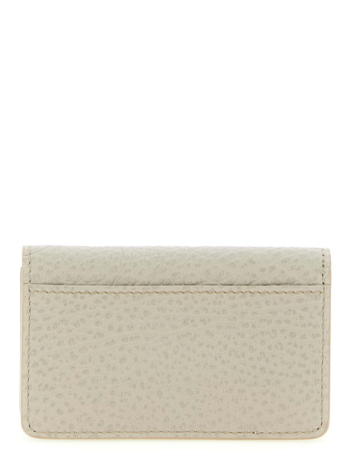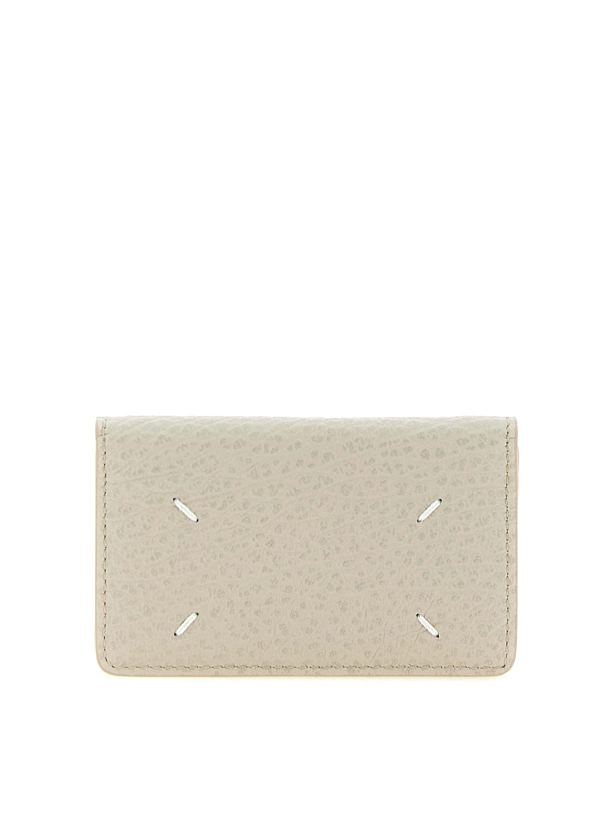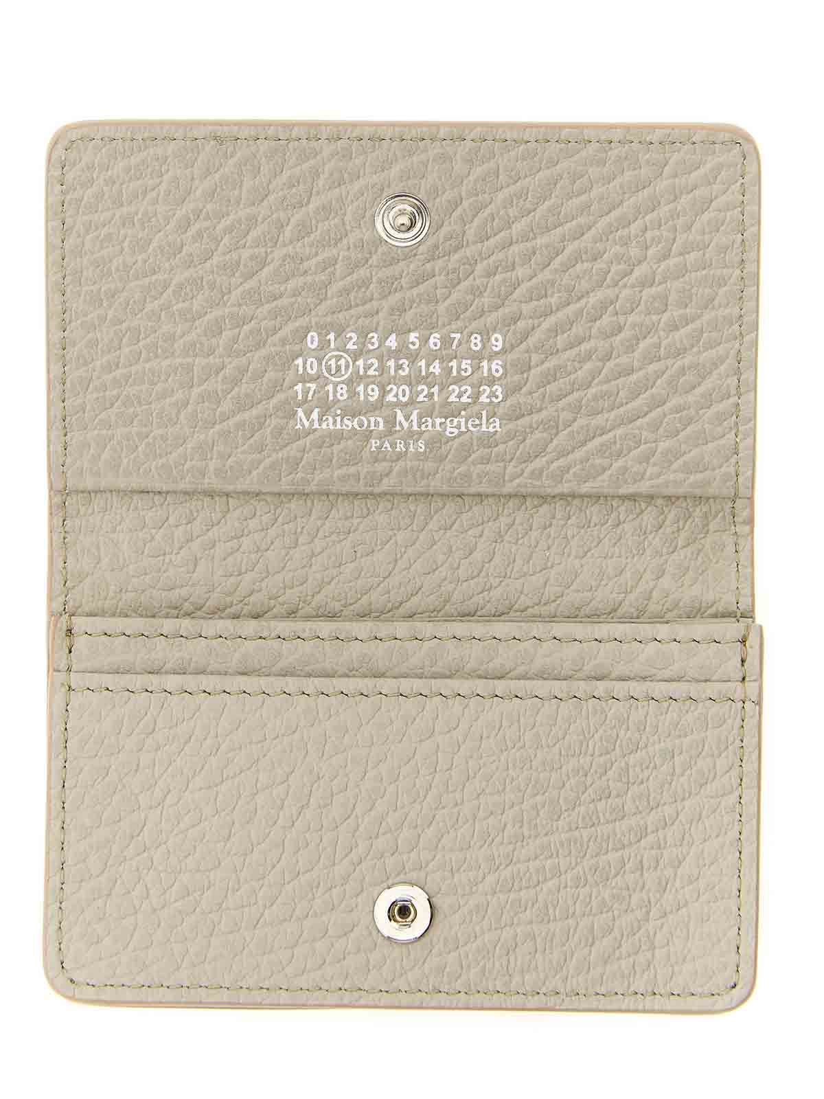 エンボス加工を施したグレインレザーのカードホルダー、スナップボタン付きのフラップクロージャー、フロント、バックポケットには「4ステッチ」、内側には「Number signature mm6」のプリントが施されています。