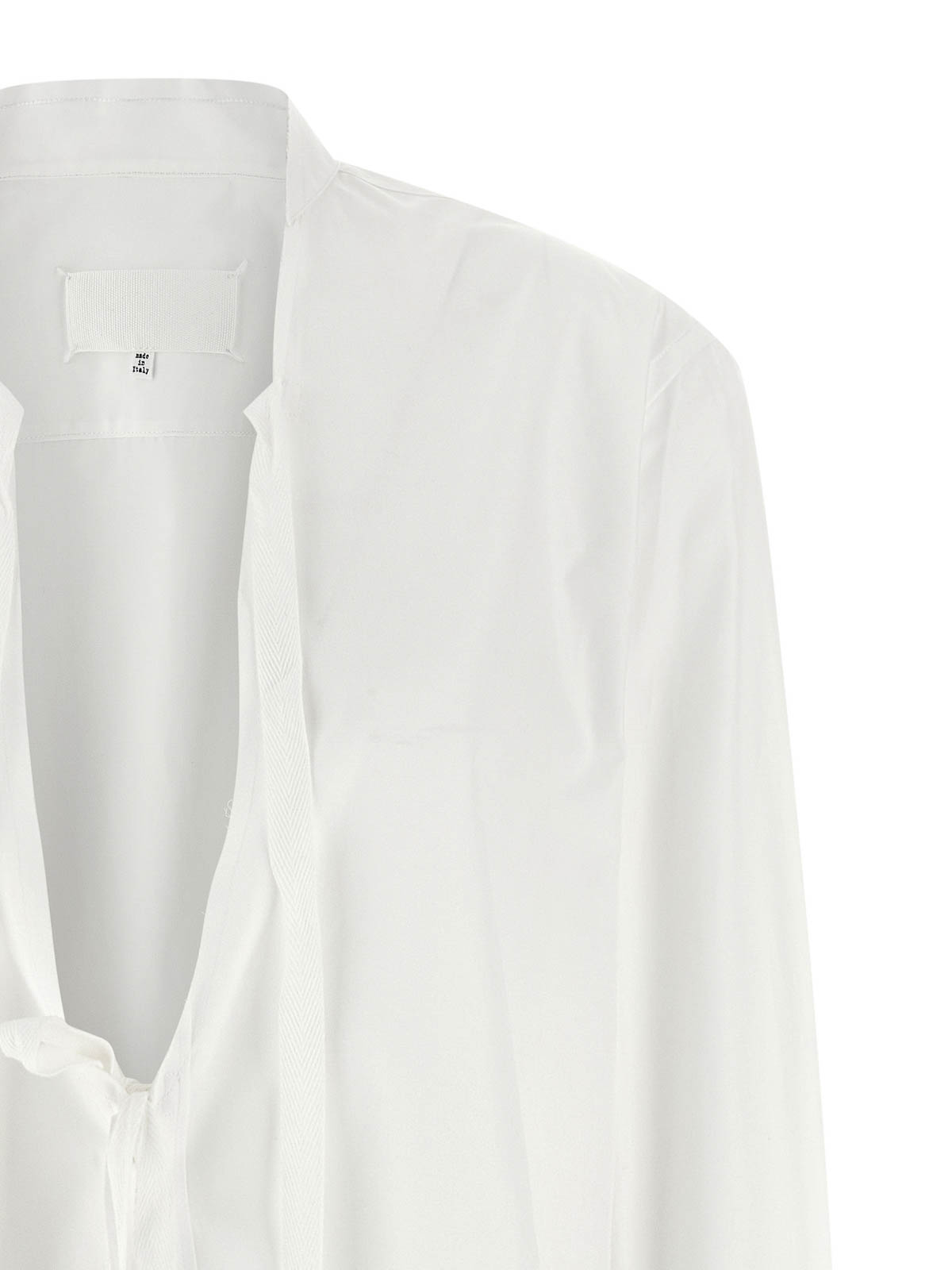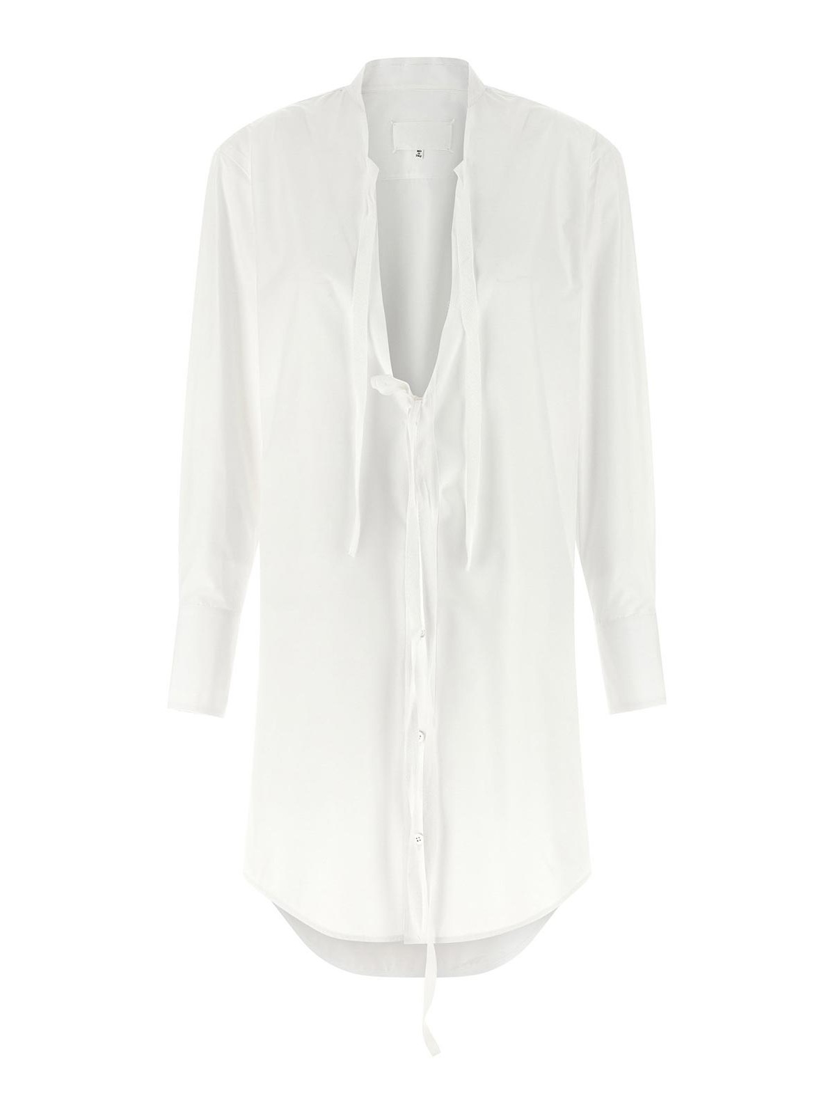 ケミシェスタイルのコットンポプリンのミニドレス、裾はロウカットのVネック、好きなように結べるトーン・オン・トーンのグログランリボン、ストレートシルエット、フロントはマザーオブパールのボタン留め、袖口付きの長袖、後ろの「4ステッチ」、丸みを帯びたアシンメトリーなヘム。