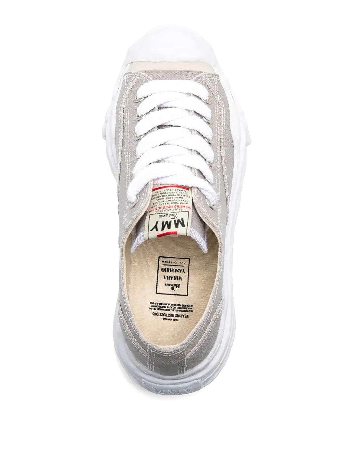 maison mihara yasuhiroのグレーのハンクロー、トップスニーカー。タンとトゥキャップにブラックステッチのロゴパッチ、ラウンドトゥレース、アップブランドイン、タンにデザイナーロゴパッチをあしらったコントラストの効いたボーダーレースが特徴。