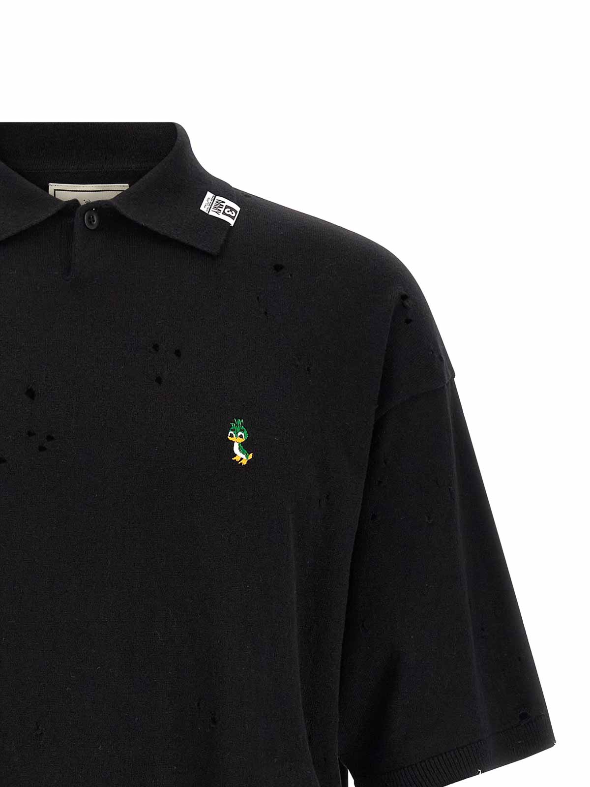 小さな穴が開いたユーズドエフェクトのコットンポロシャツ、刺繍、前面にロゴパッチ、オープンカラー、袖口とドロップショルダー付きの半袖、裾にヘッドバンドが付いています。