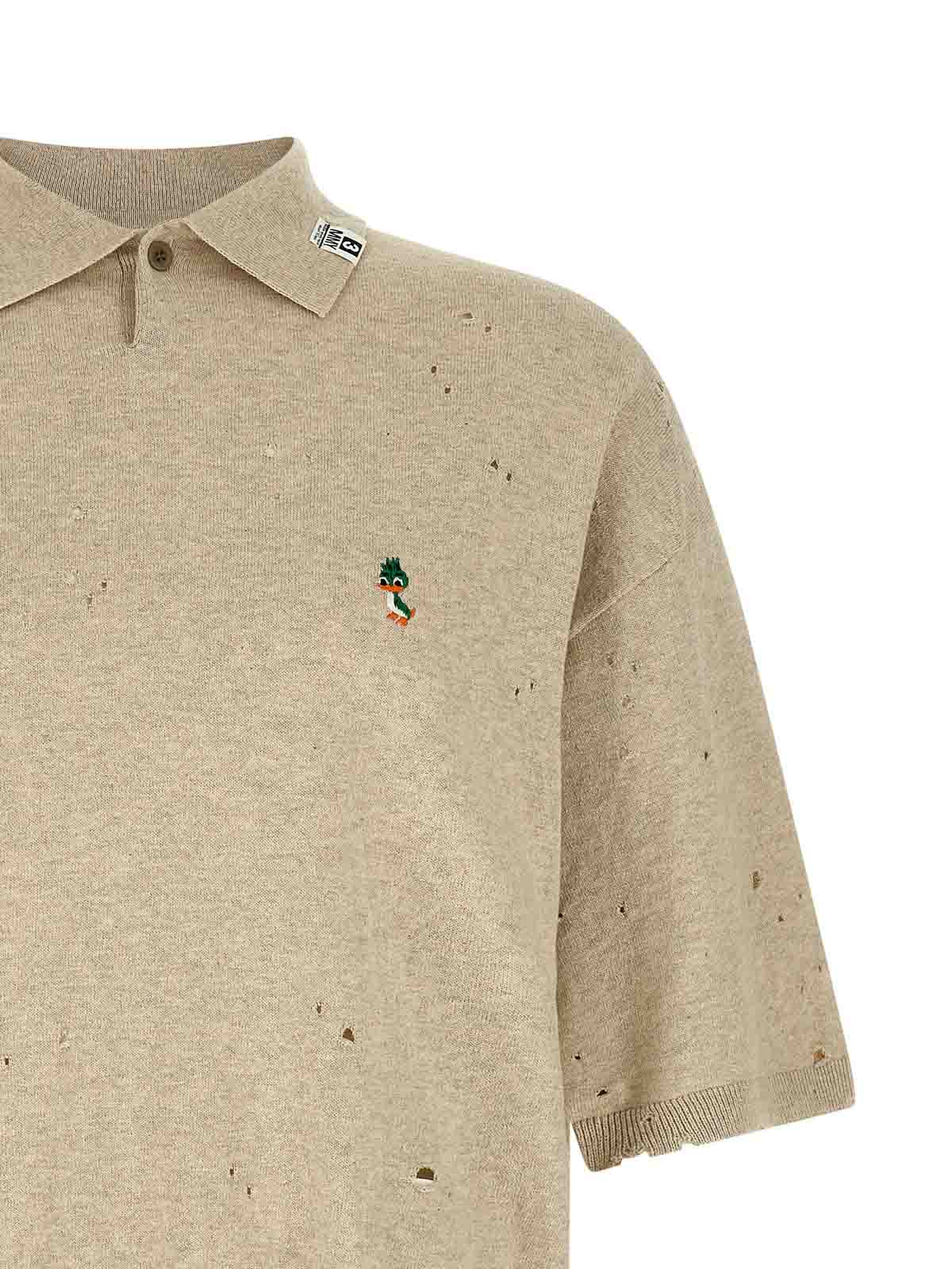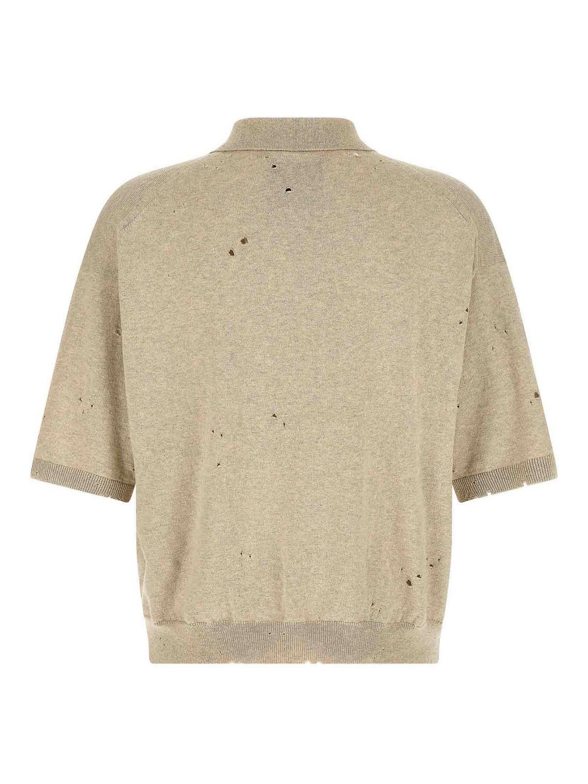 小さな穴が開いたユーズドエフェクトのコットンポロシャツ、刺繍、前面にロゴパッチ、オープンカラー、袖口とドロップショルダー付きの半袖、裾にヘッドバンドが付いています。