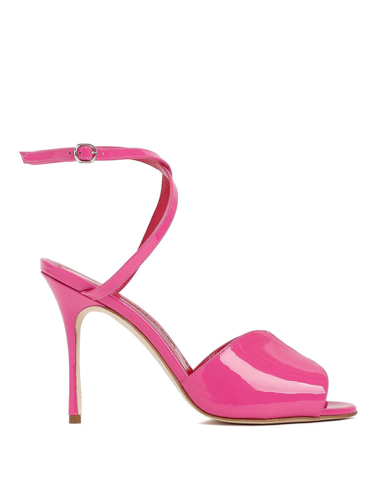 Manolo blahnikピンクのパテントカーフレザーのフーラニサンダル。丸くて開いたつま先、調節可能なアンクルストラップ、ハイスティレットヒール、レザーインソール。