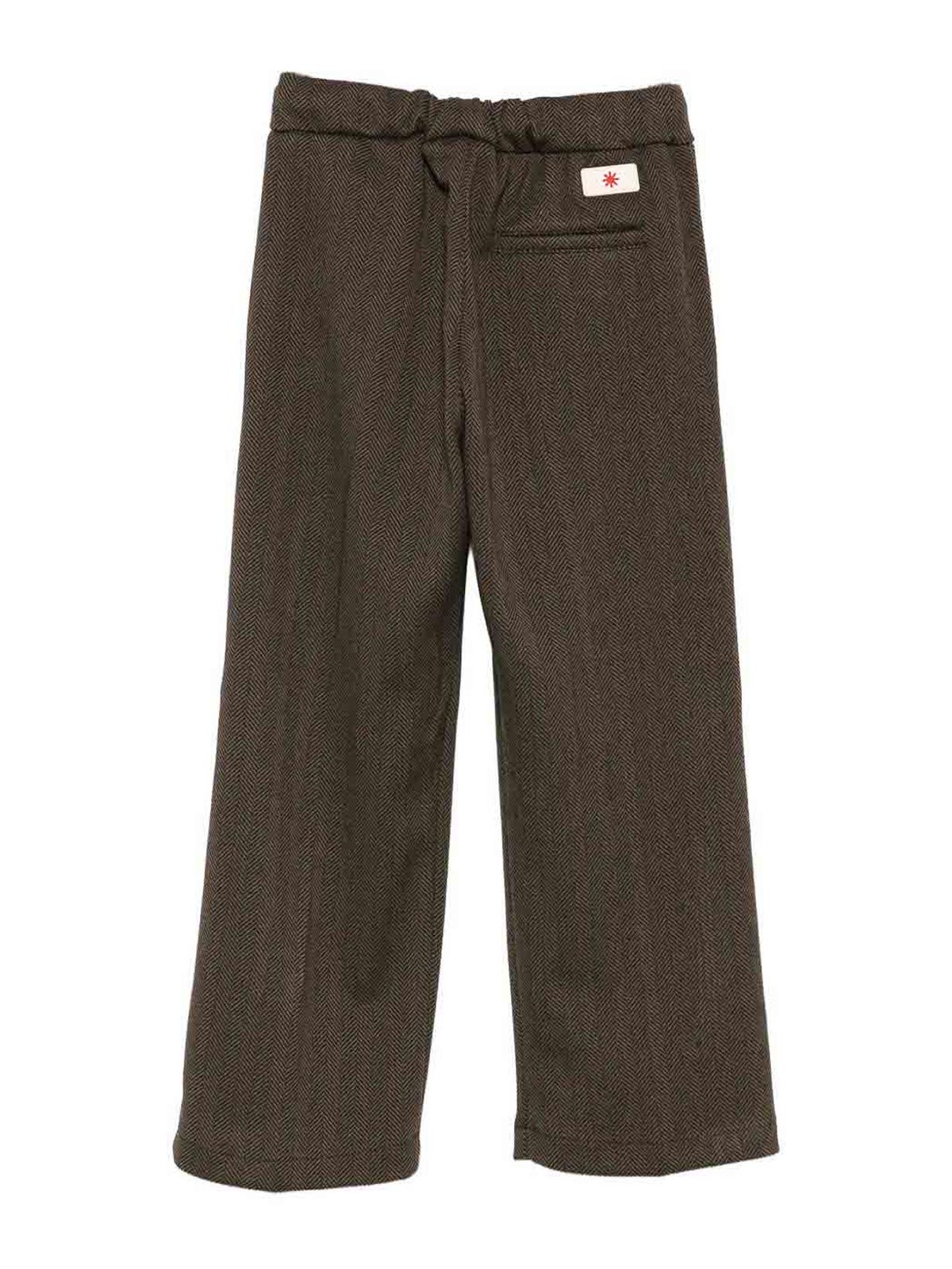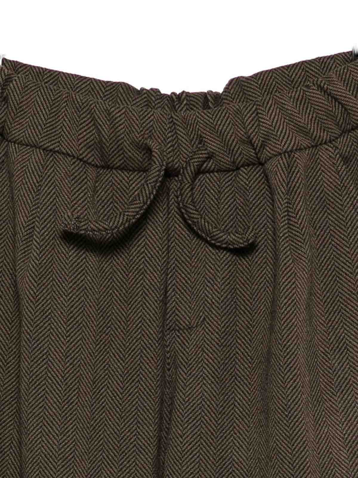 ドローストリングパンツは、茶色のヘリンボーン柄、伸縮性のあるドローストリングウエスト、輪郭のあるバックポケットが特徴です