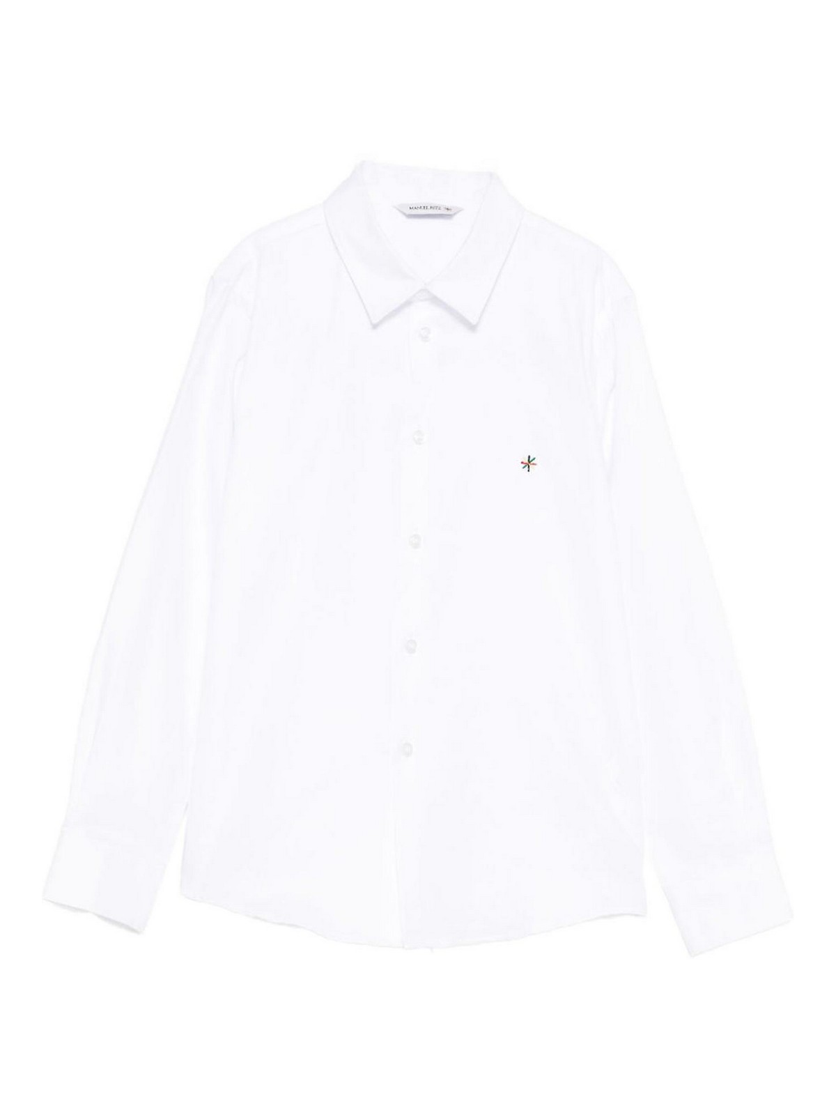 白い刺繍をあしらったシャツ、長袖、ボタン付きの裾、クラシックな襟
