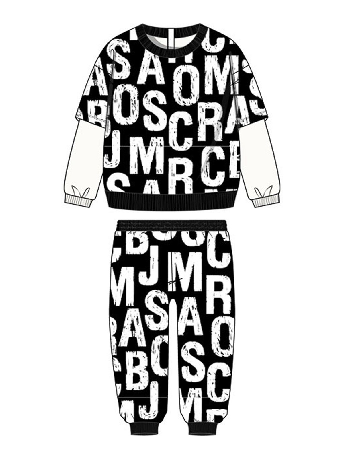 全面に黒と白のロゴプリント、長袖の上、ウエストゴム入り、足首のヘム