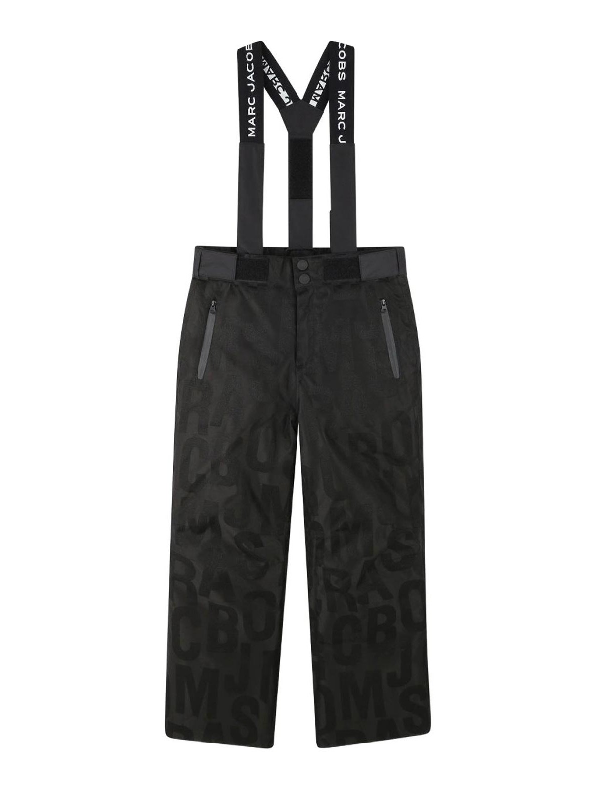 プリント付きダンガリー。黒のエンボス加工ロゴモチーフ、調節可能なブレース、ジッパー付きバックポケット付きサイドポケット。