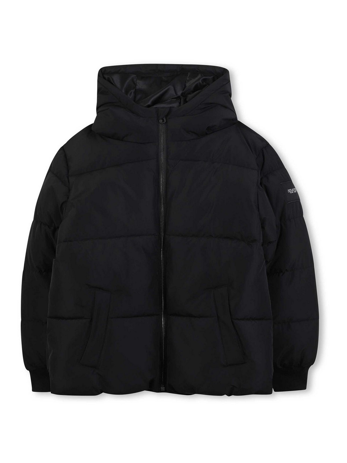 ブラックのジッパー、フロントポケット2つ、フードにロゴディテール、キルティングデザイン、伸縮性のある裾