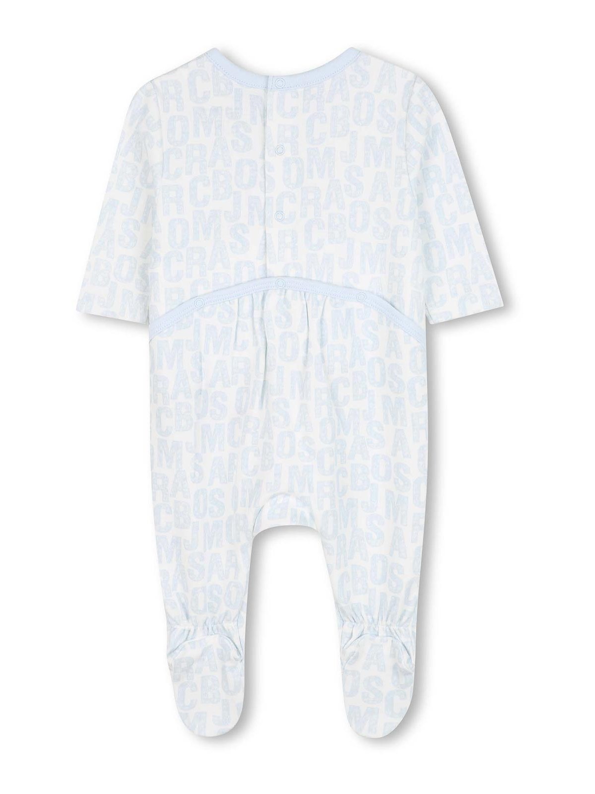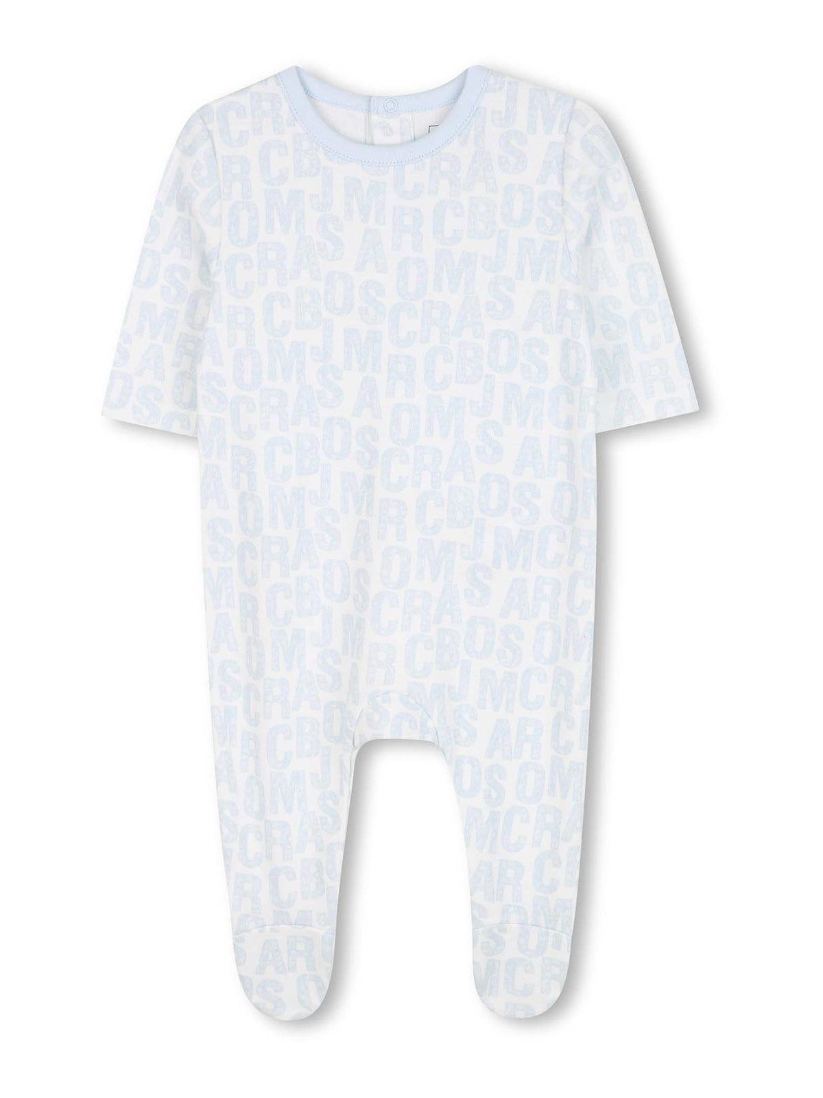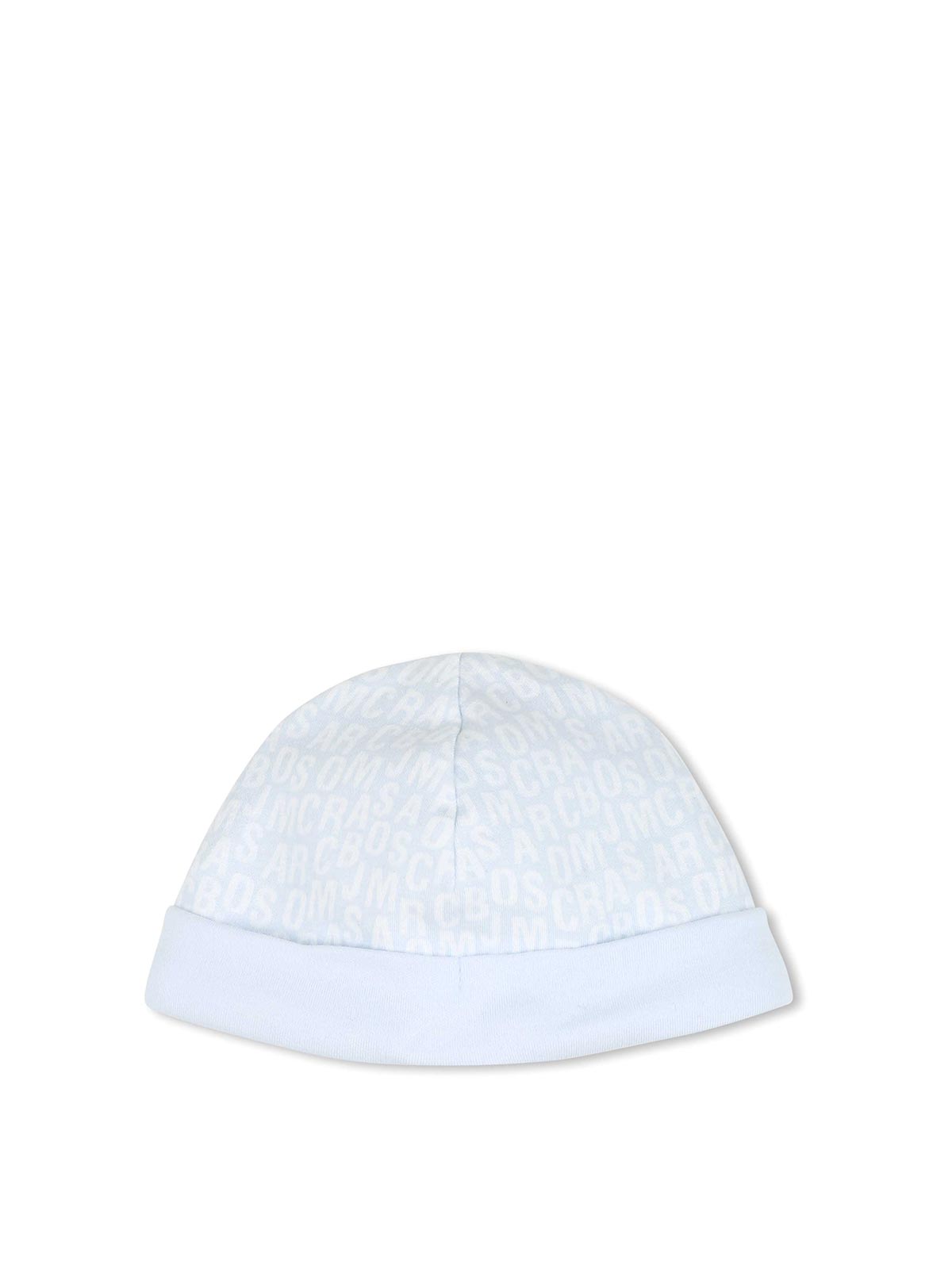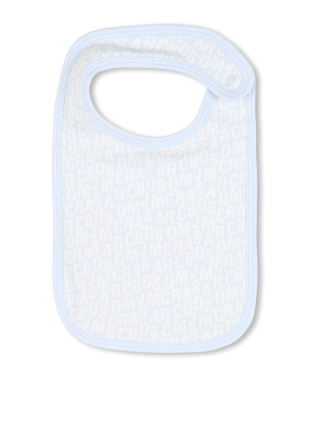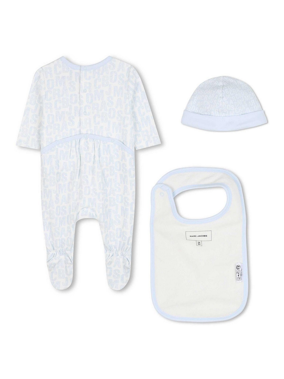 全体にロゴをあしらったライトブループリント、長袖、コーディネートされたビブ、スナップバック付きのコーディネートされた帽子