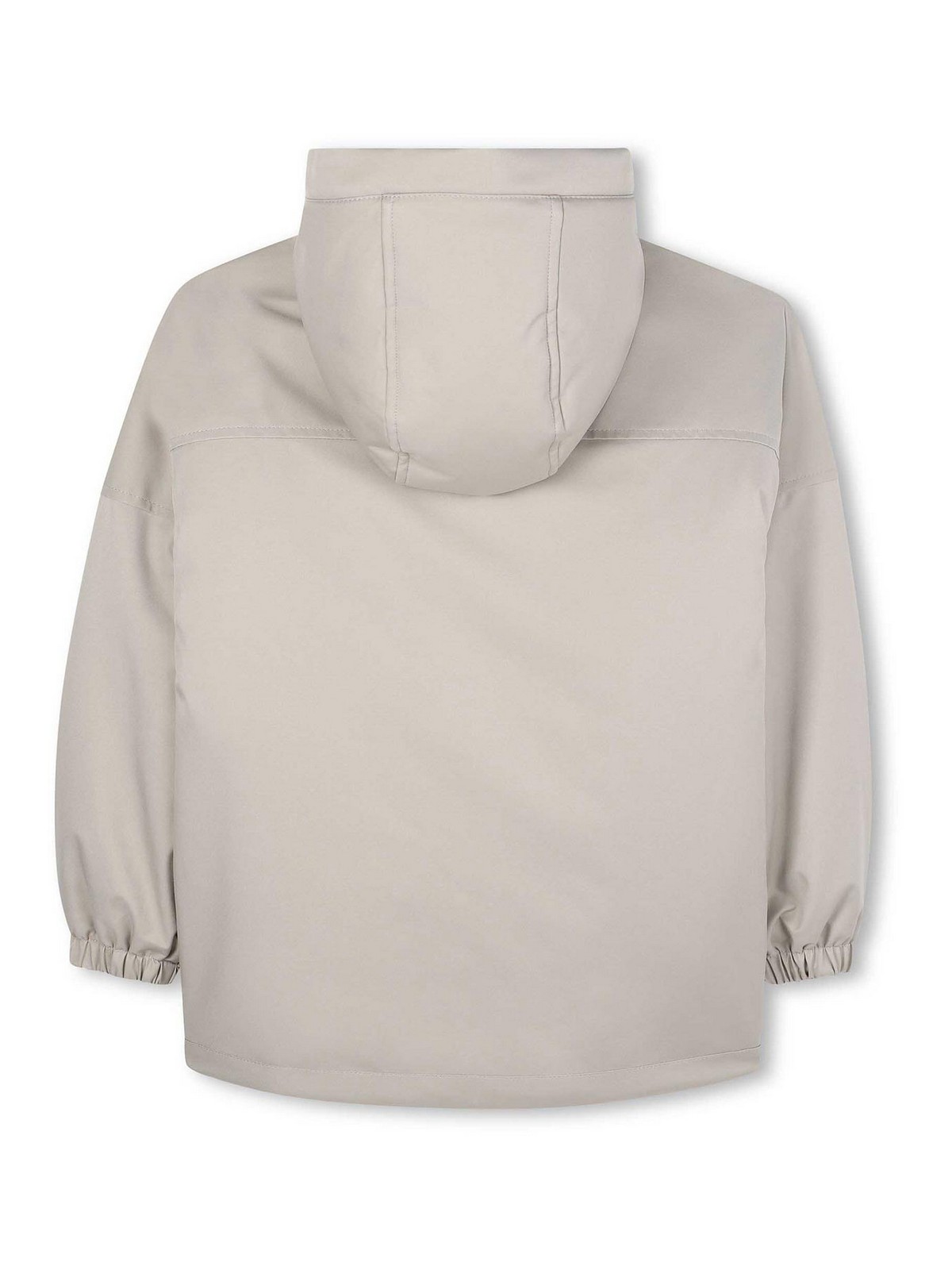 ライトグレー、大きなフロントポケット2つ、ファスナー付き胸ポケット2つ、調節可能なフード、ドローストリング付き、伸縮性のあるヘム