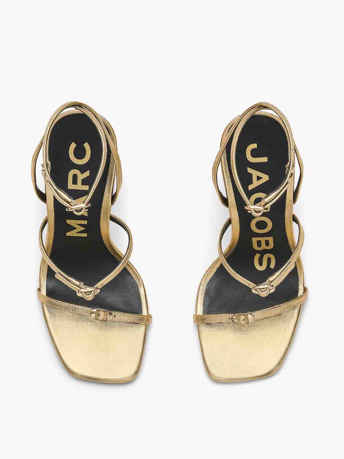 ゴールドのデイジーヒール。マーク・ジェイコブスのレザーヒールサンダル。調節可能なアンクルストラップ付き。ダングリングチャームとバンドのバックルストラップで装飾されています。モデルにはデイジーをあしらった彫刻的なヒールがあしらわれています。オープントゥ、ニードルバックルストラップ、調節可能なアンクルストラップクロージャー、装飾的なダングリングチャーム、彫刻的なデイジーヒール。