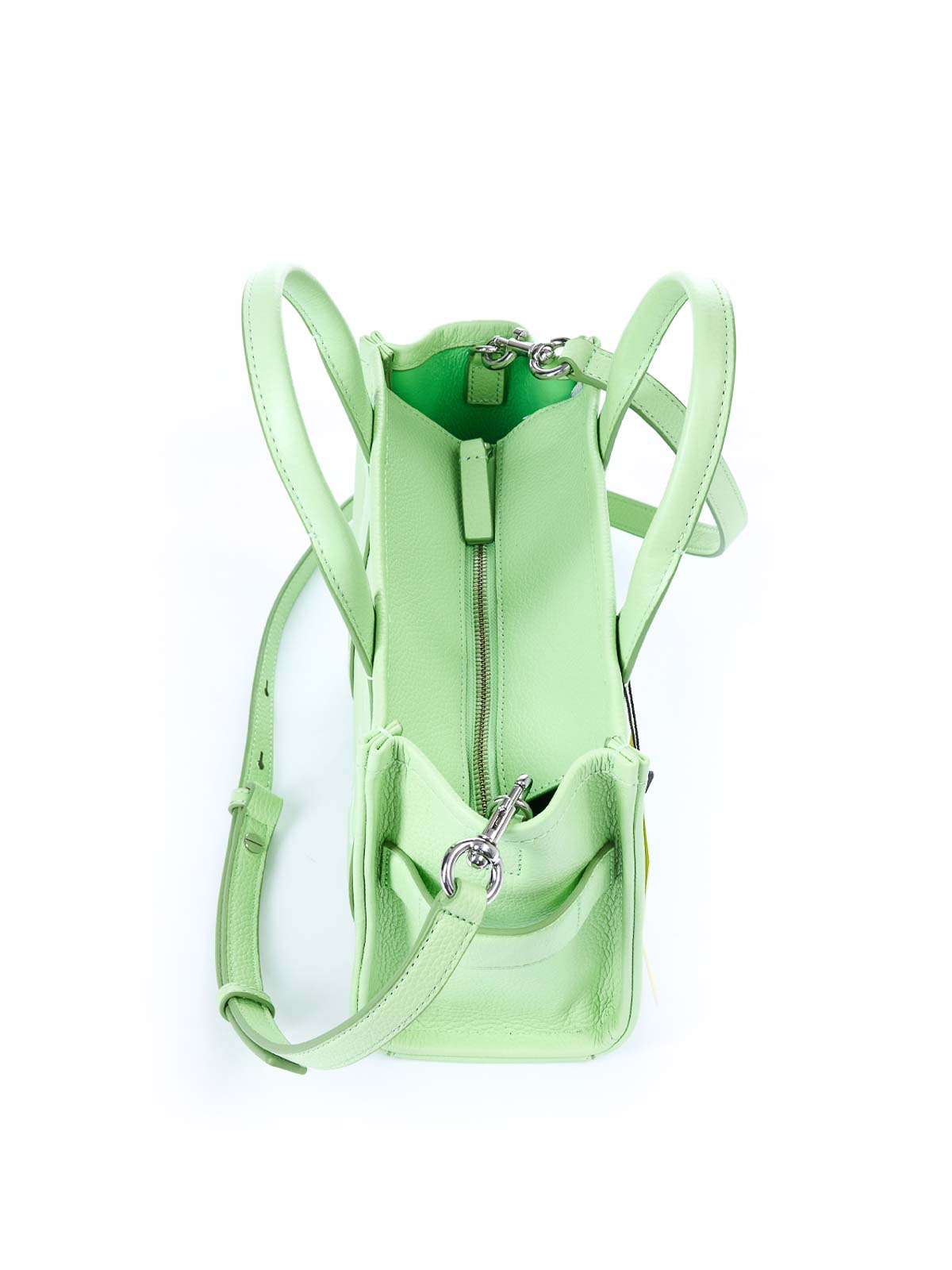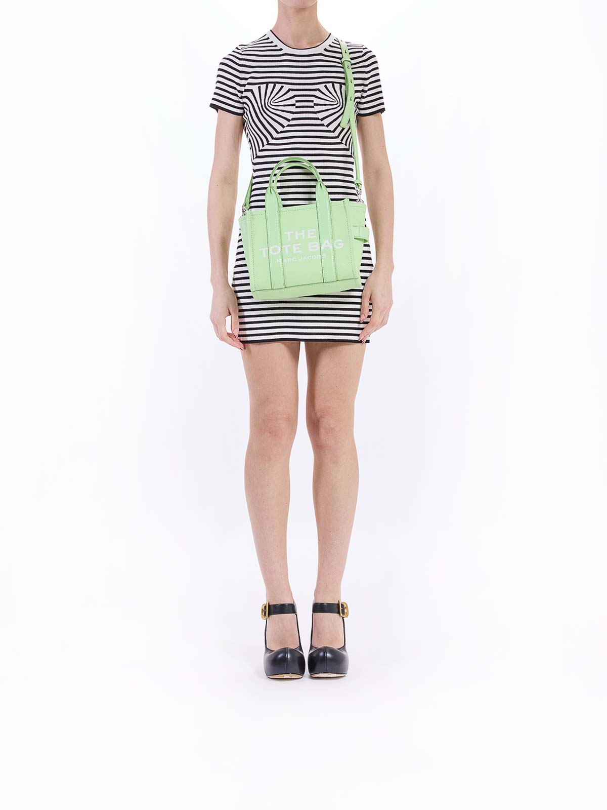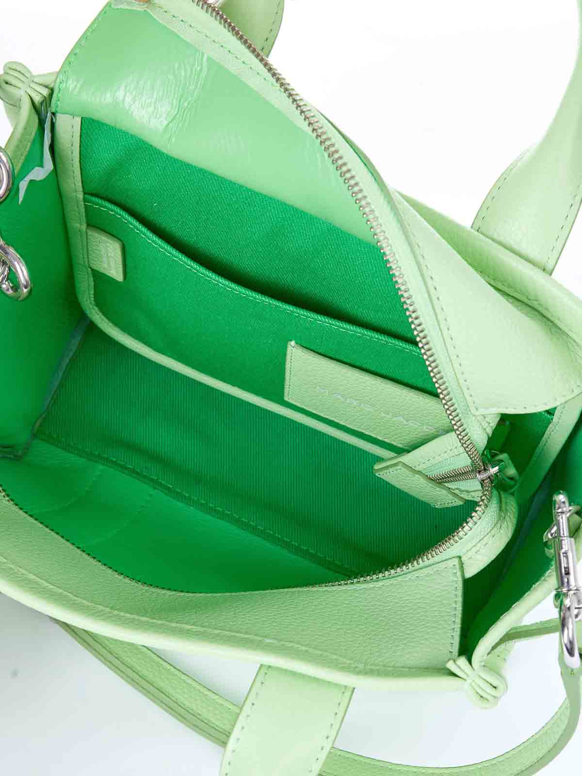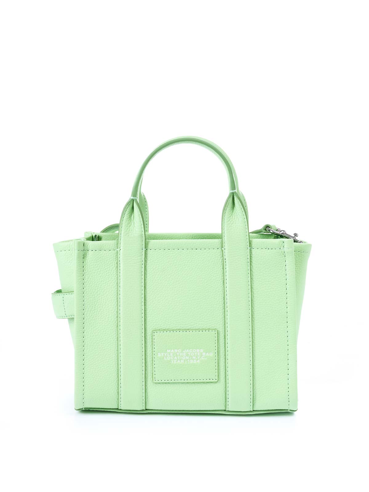 ライトグリーンのスモールレザートートバッグは、プレミアムレザー製のアイコニックなスモールトートバッグで、前面にトーン・オン・トーンのザ・トートバッグのプリントが施されています。手で持ち運べる2つの硬いトップハンドルと、クロスボディまたはショルダーバッグとして着用できる取り外し可能で調節可能なレザーショルダーストラップが特徴です。上部はファスナー付きで、内側にはスリップポケットとカードスロットが付いています。前面にトートバッグのグラフィックがプリントされています。ダブルリジッドトップハンドル。調節可能で取り外し可能なコントラストカラーのショルダーストラップ。背面にロゴラベルが刺繍されています。内側にはスリップポケットとカードスロットが付いています。上部はファスナーで開きます。保護用ダストバッグ。