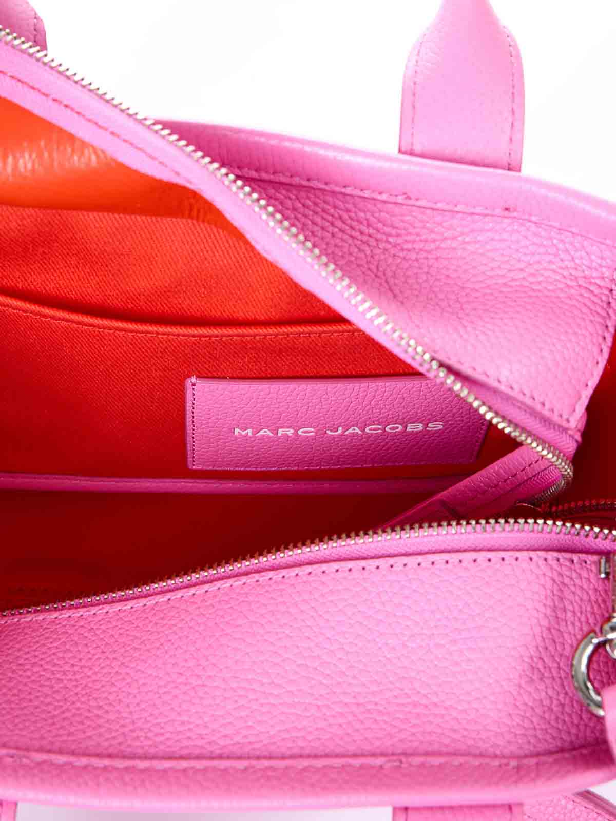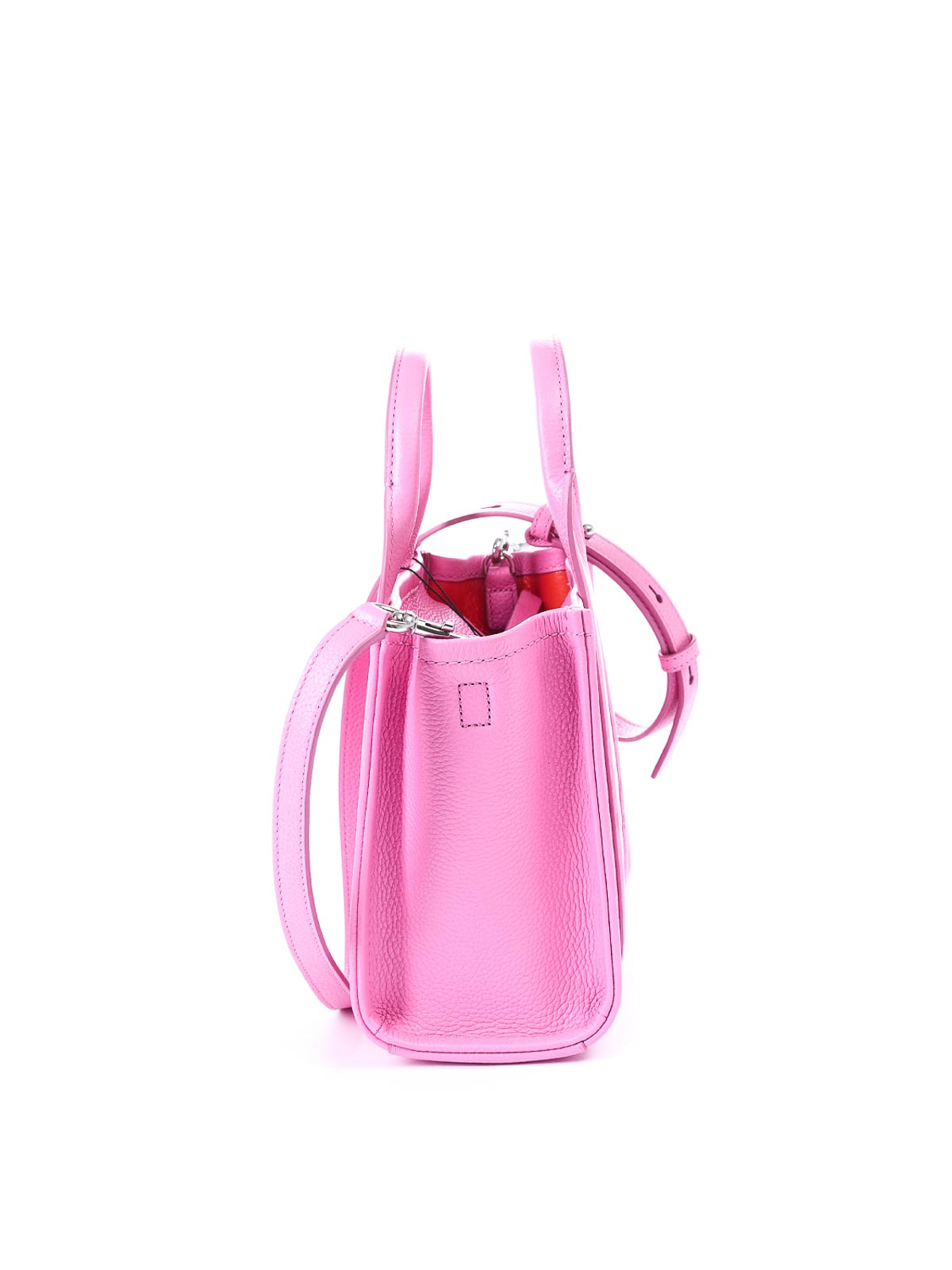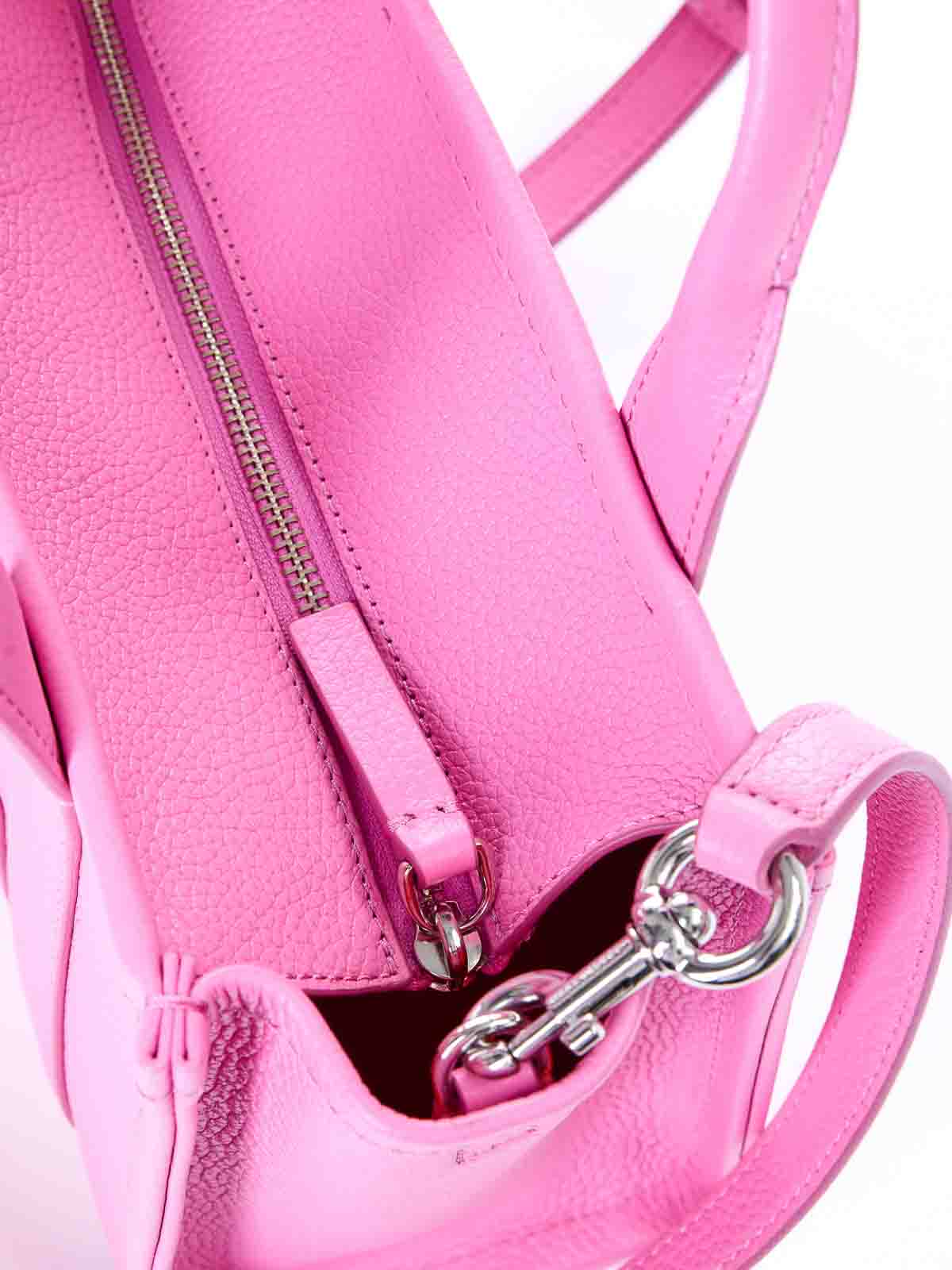 ピンクのスモールレザートートバッグは、プレミアムレザー製のアイコニックなスモールトートバッグで、前面にトーンオントーンのトートバッグのプリントが施されています。手で持ち運べる2つの硬いトップハンドルと、クロスボディまたはショルダーバッグとして着用できる取り外し可能で調節可能なレザーショルダーストラップが特徴です。上部はファスナー開閉式で、内側にはスリップポケットとカードスロットが付いています。前面にはトートバッグのグラフィックがプリントされており、ダブルリジッドハンドル、調節可能で取り外し可能なコントラストカラーのショルダーストラップ、背面にロゴラベルの刺繍、スリップポケットとカードスロット付きの内装、上部にファスナー付きの開口部、保護用ダストバッグが付いています。カラー:ピンク、100% カーフスキン、21 x 26 x 13 cm。