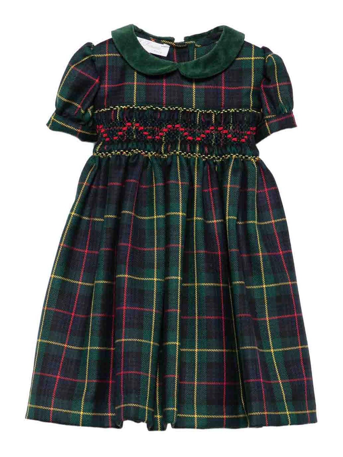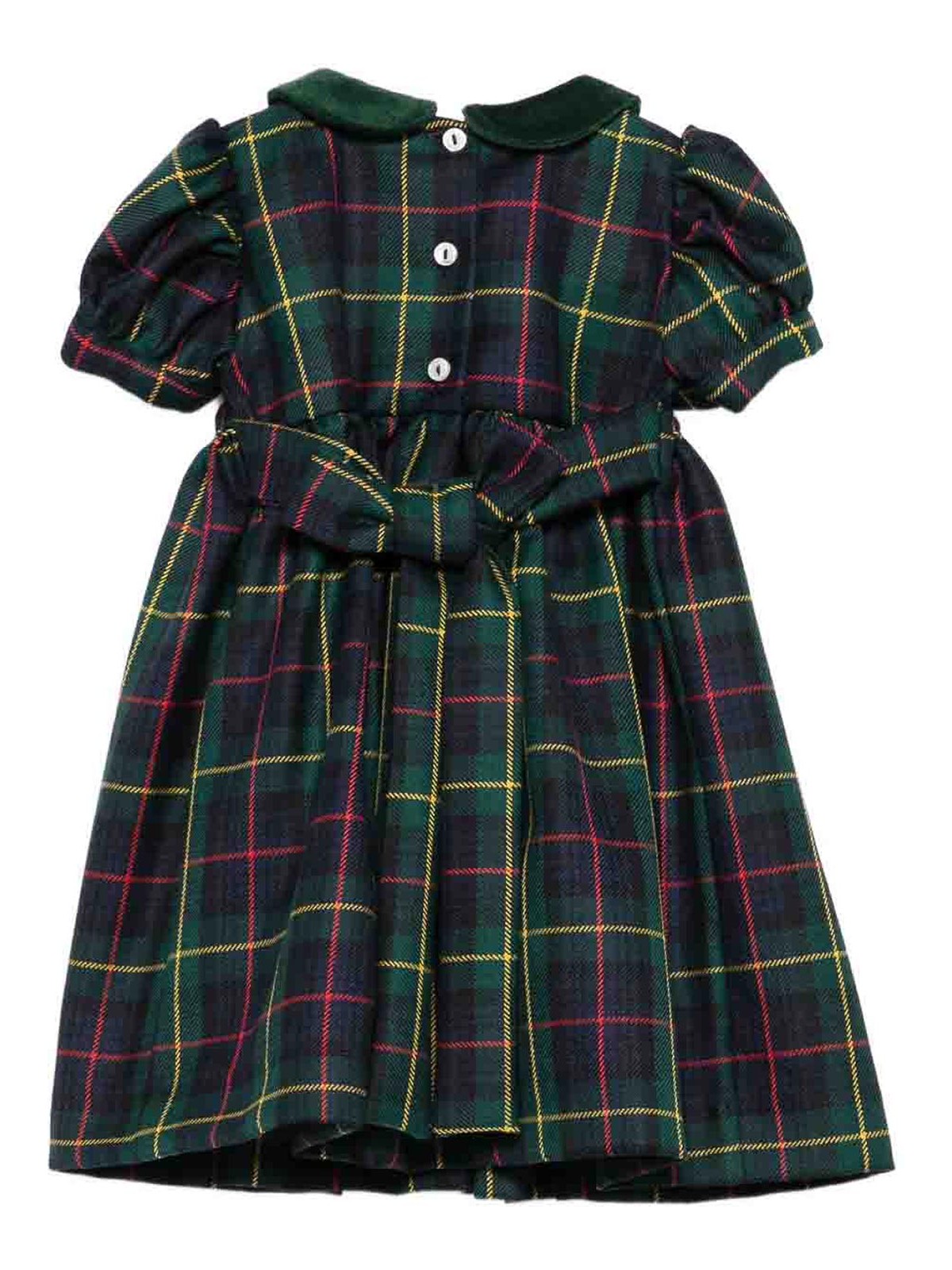 チェックワンピースは、ダークグリーンのハニカムタータン柄のピーターパンカラーのショートバルーンスリーブで、後ろにボタンが付いています。