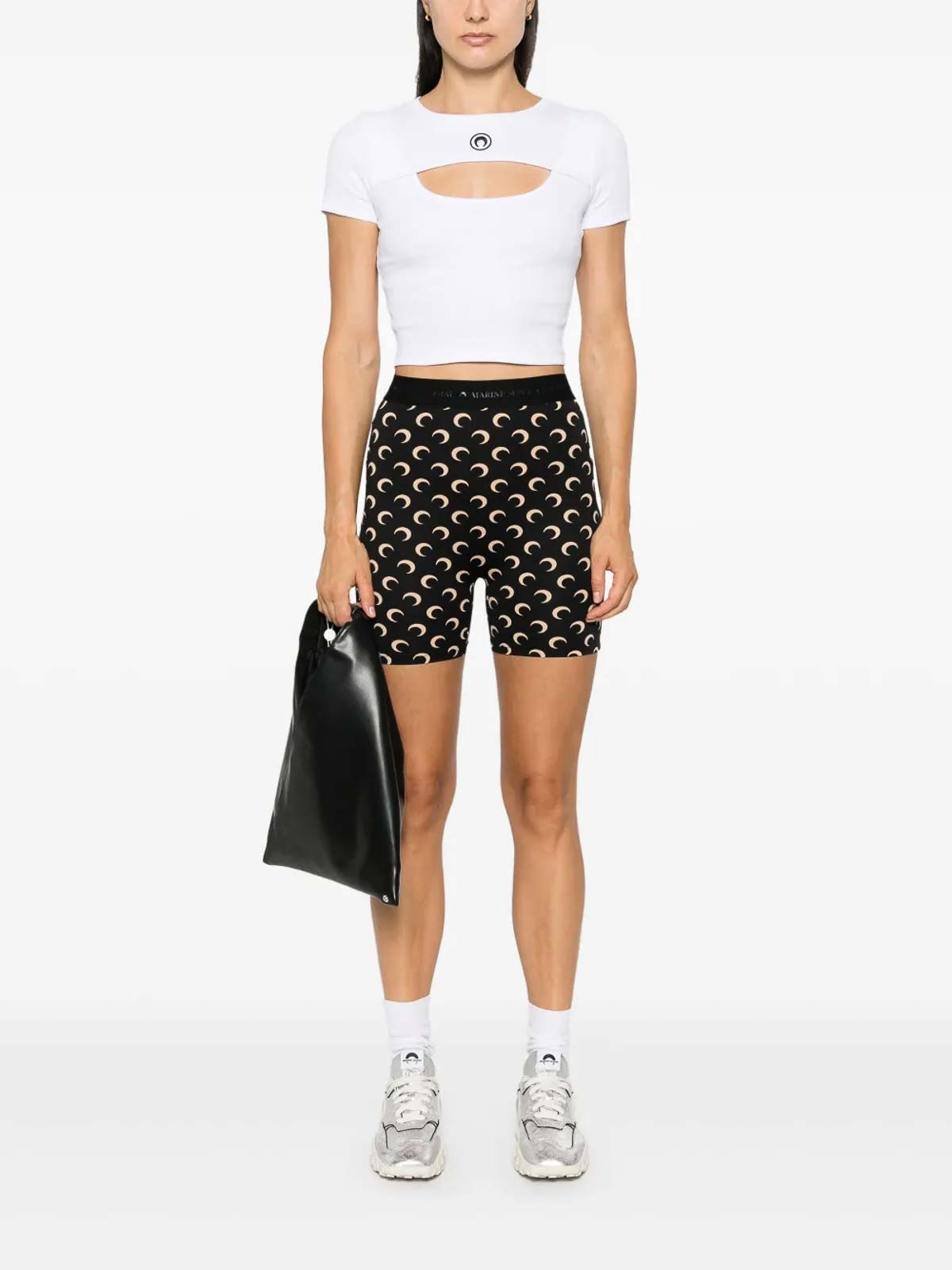 ブラック/ベージュ混紡ストレッチ、デザインシグネチャームーンプリント、伸縮性のあるロゴ入りウエストバンド、ストレートヘム、太もも、長さ