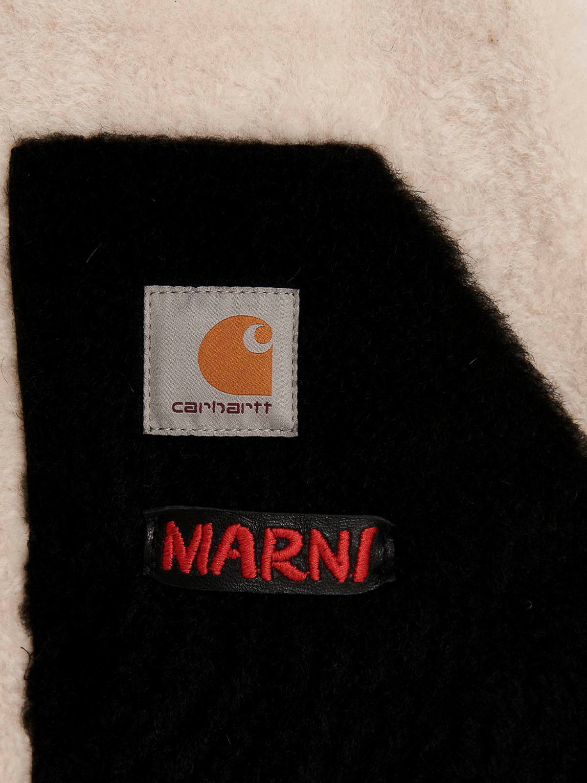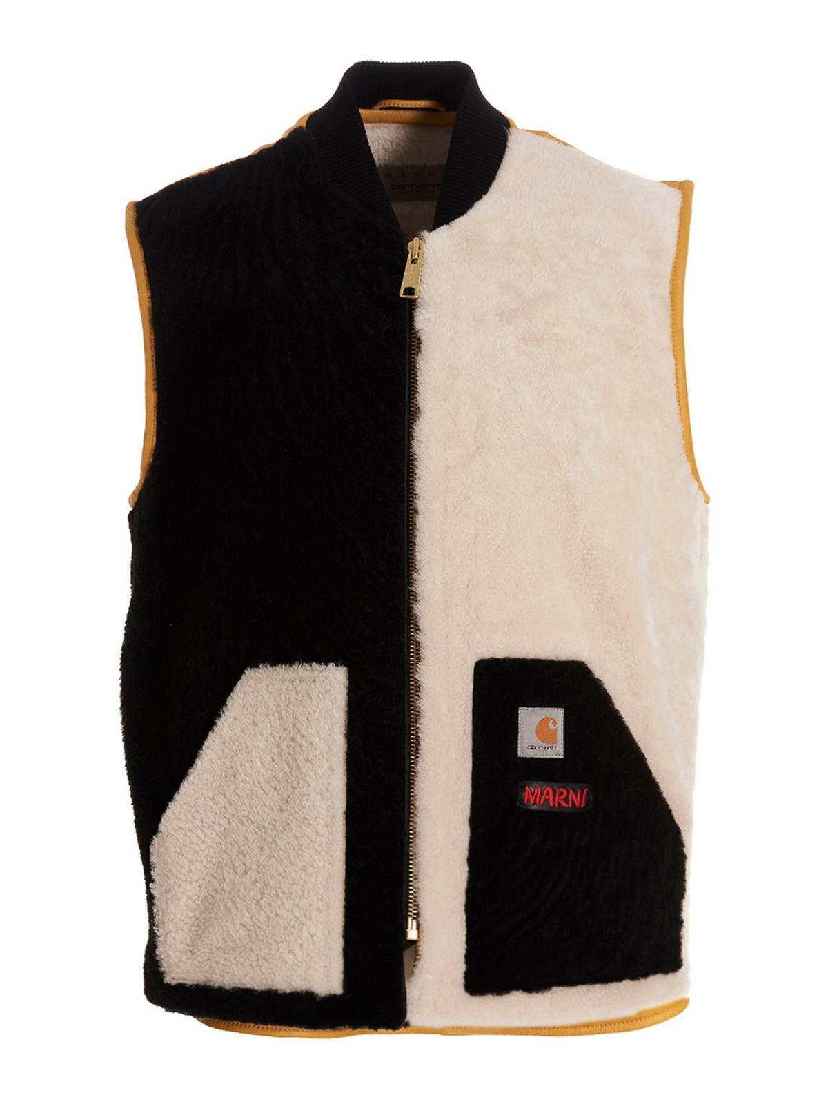 Marni x carharttのレザーとファーのベスト、ジップクロージャー、フロントロゴパッチ、ポケット付き。