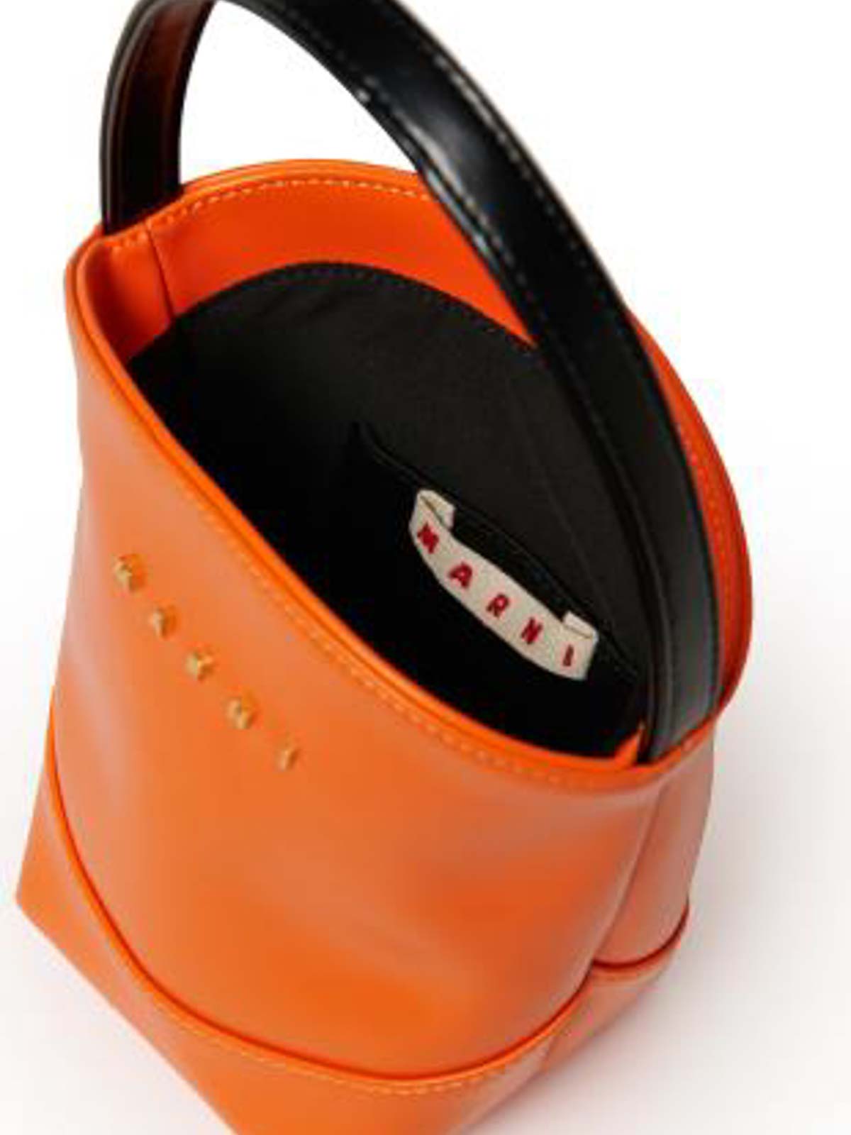 オレンジ色のハンドル、ハンドルの付け根の端に文字が入った青いロゴ