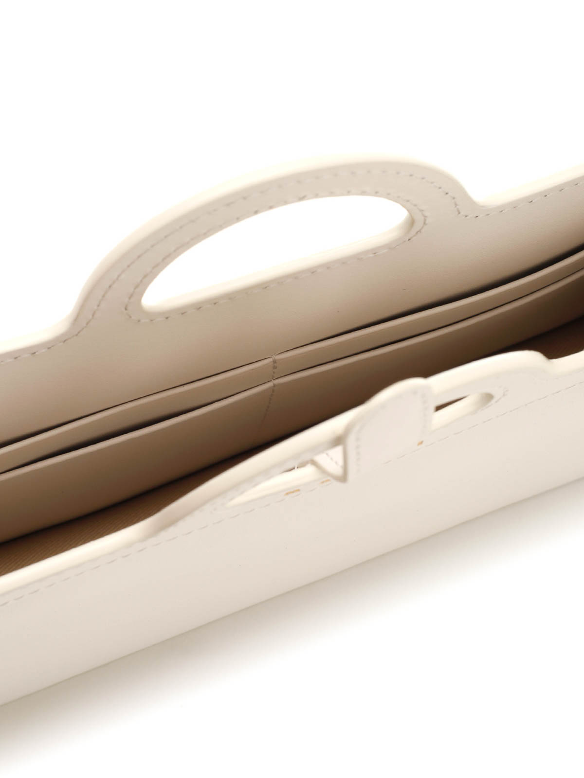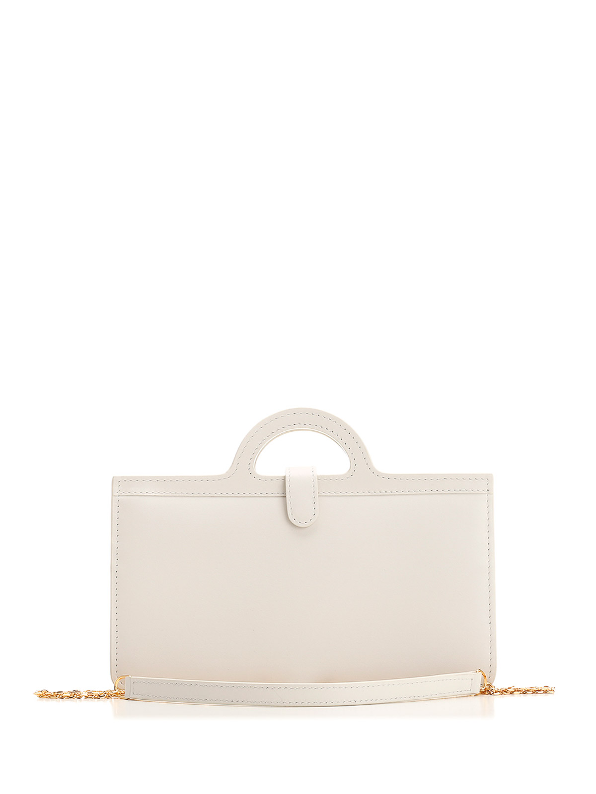 マルニのトロピカリアウォレット、ホワイトレザー、ロングチェーンショルダーストラップ、自動ボタン、前面にゴールドプリントのマルニロゴが付いています。