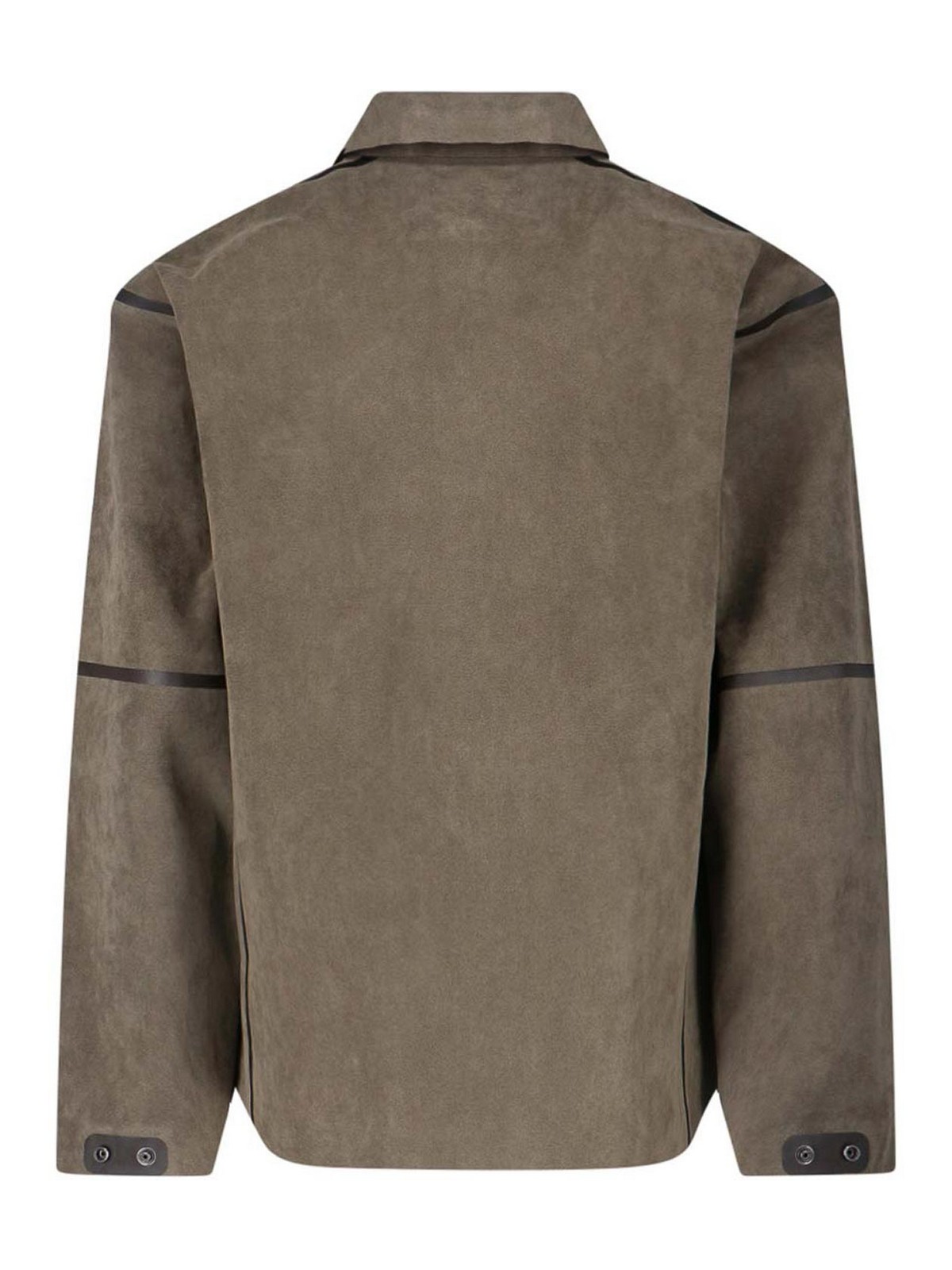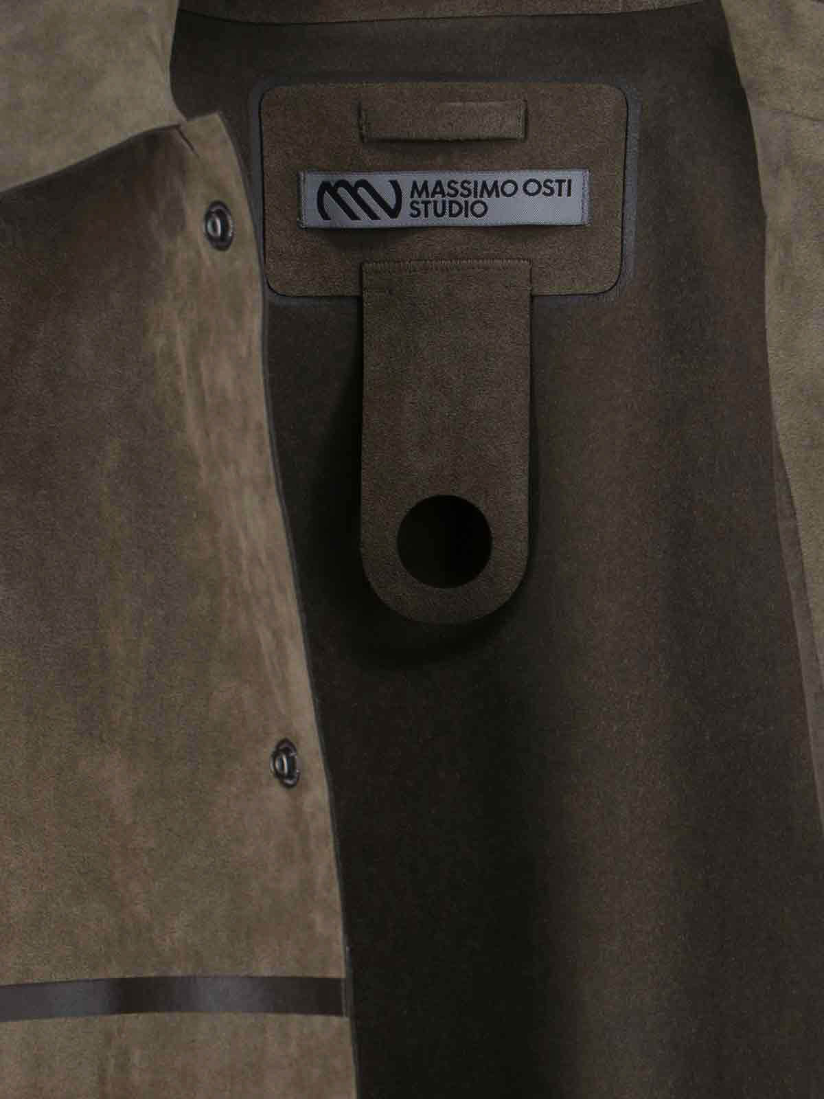 Massimo Osti Studio alcantara シャツジャケット、グリーン、クラシックカラー、スナップボタンクロージャー、コントラスト仕上げ、フロントジッパーポケット1つ、内部フックディテール、ボタン付きカフス、ストレートヘム。
