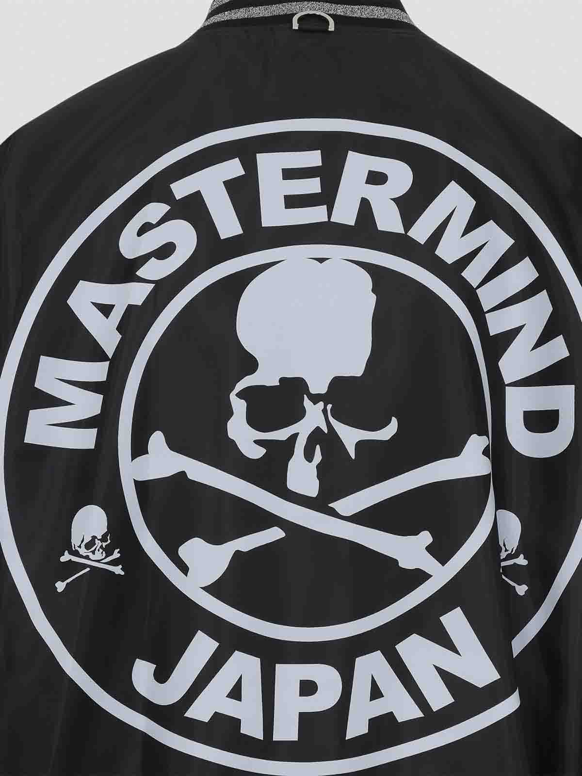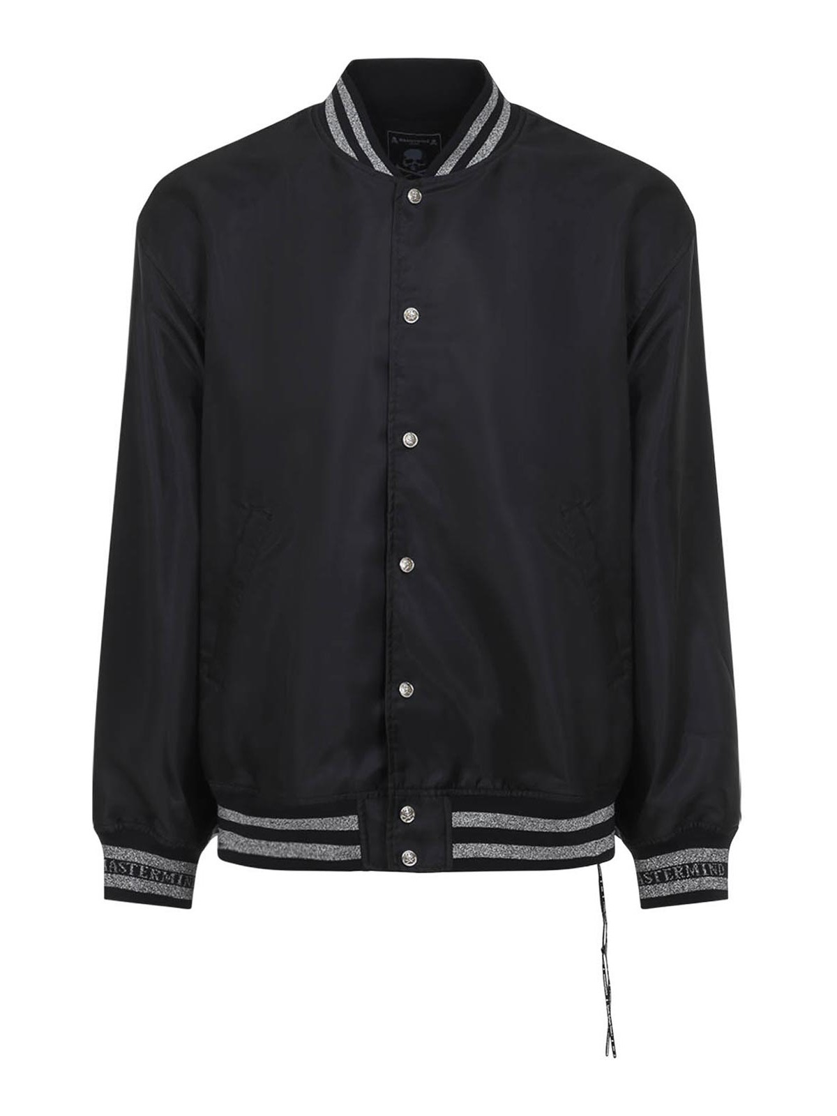 Mastermind Japanブラックバーシティジャケット。ポリエステル生地製。スタンドアップリブ編みの襟、白いストライプ、フロントボタン留め、サイドポケット、後ろに白いレタリングロゴ、ドロップショルダー、長袖、白いストライプのディテールが施されたリブ編みの袖口と裾、サイドブラックストラップ、ストレートヘム。