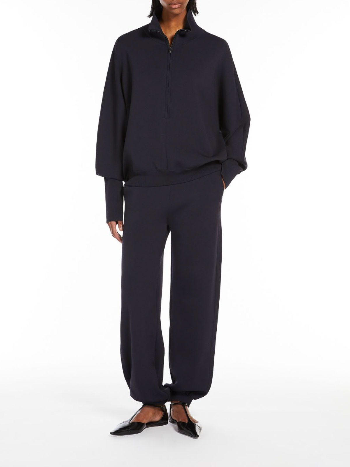 ストレッチの効いたインターロック糸を使用したファトゥオシャツ。前半のファスナーで閉じるハイネックと、着物の入った長袖が特徴で、裾と手首にリブ編みのモチーフをあしらいました。