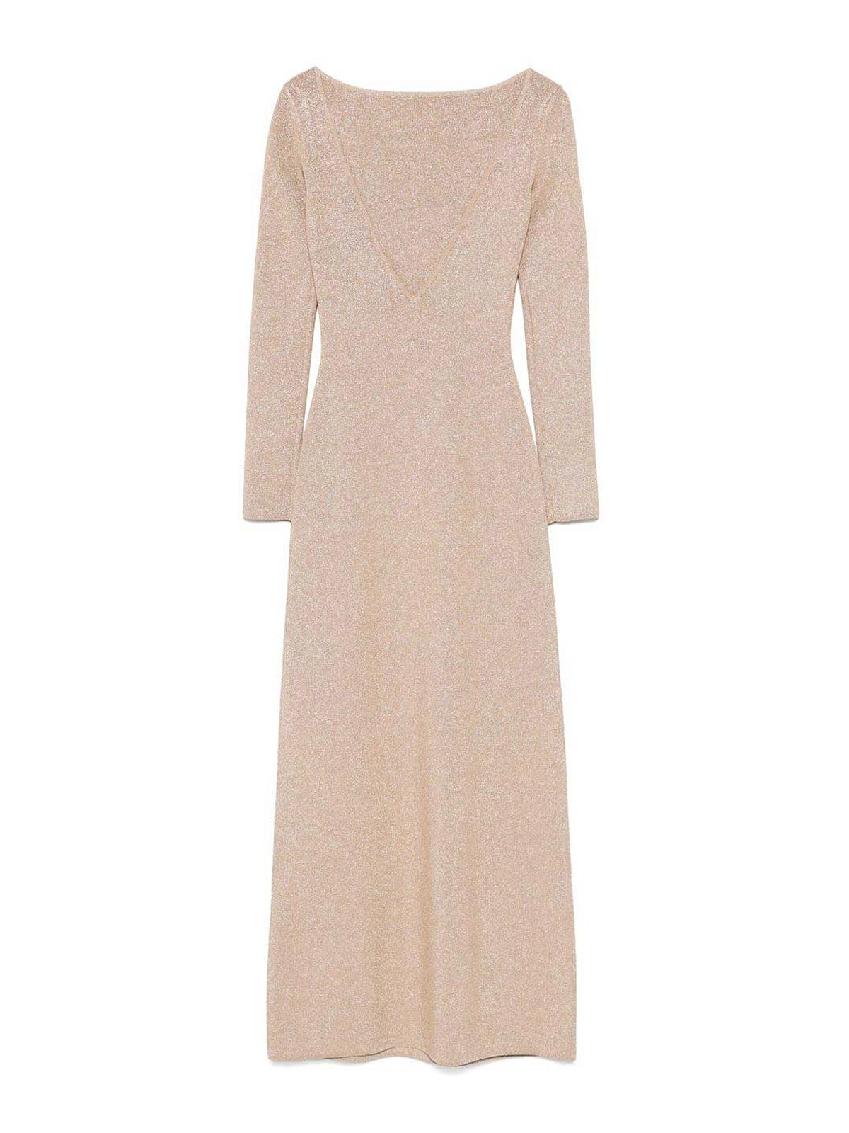 ビスコースとルレックスの無地ニットのドレス。後ろに深いVネックが付いています。セットインスリーブ、裏地なし。