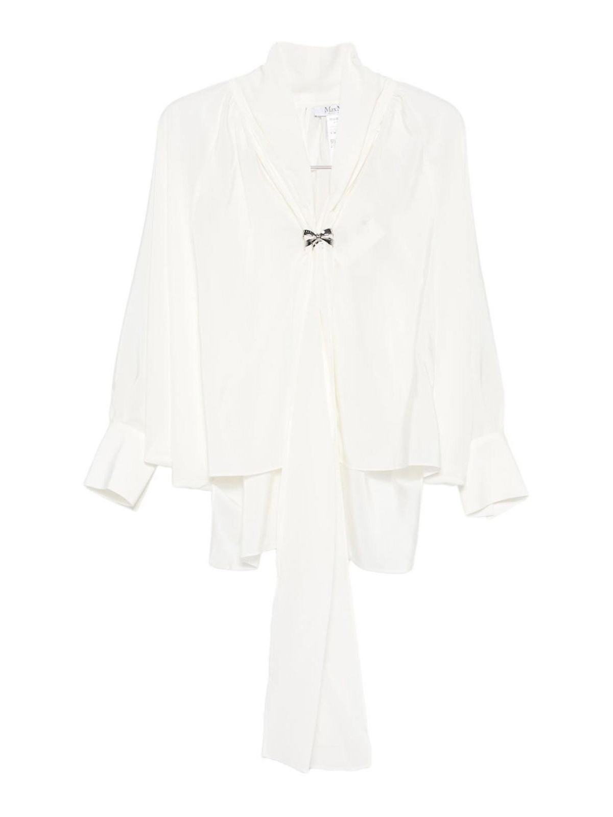 ピュアシルクのクレープデシンブラウス。Vネックで蝶ネクタイで結べます。襟はリボンで結べます。背中中央にスラッシュモチーフのサイドボタンが付いたハイカフス、取り外し可能なメタルループ。裾は左右非対称、後ろは長めです。