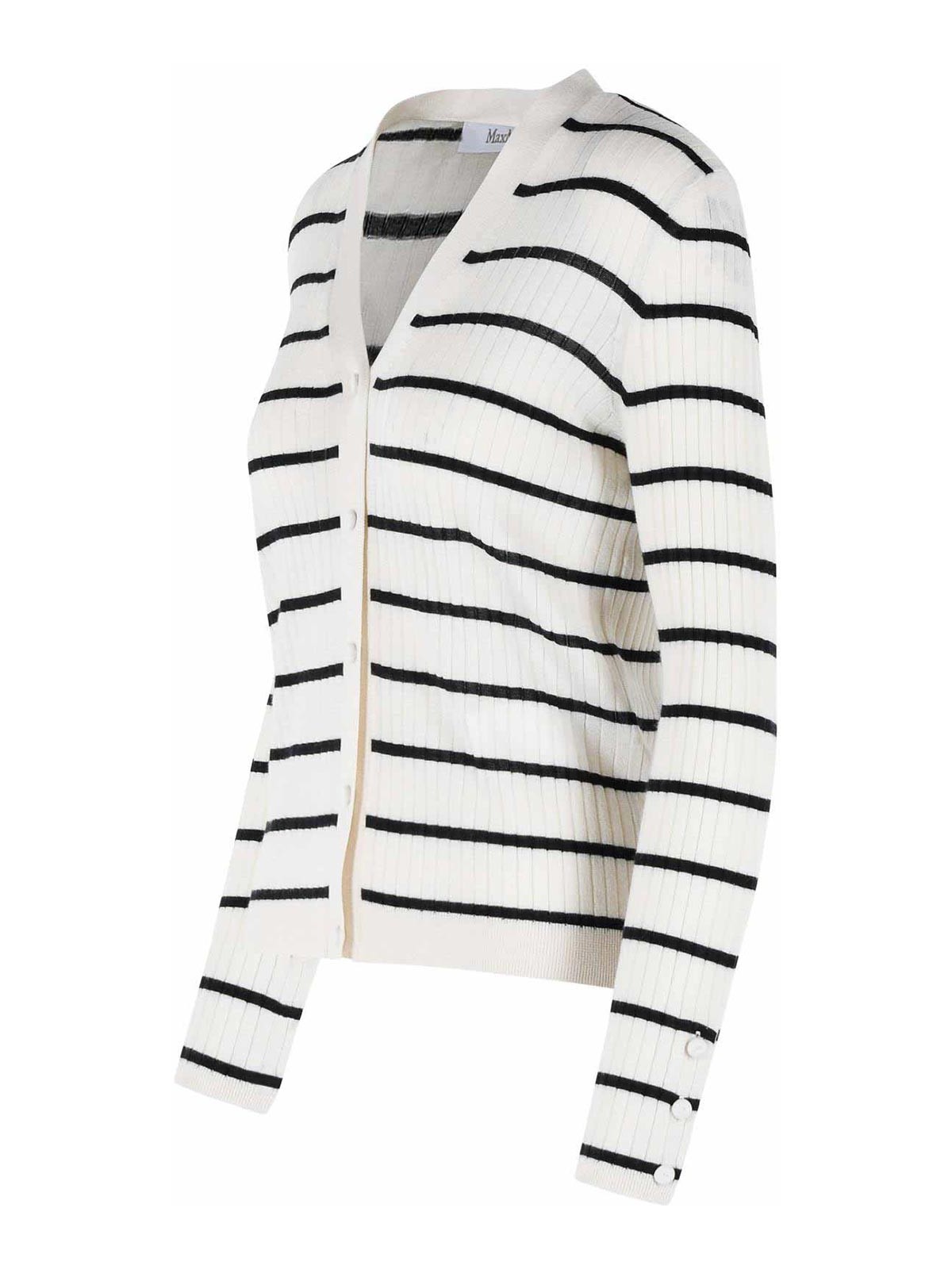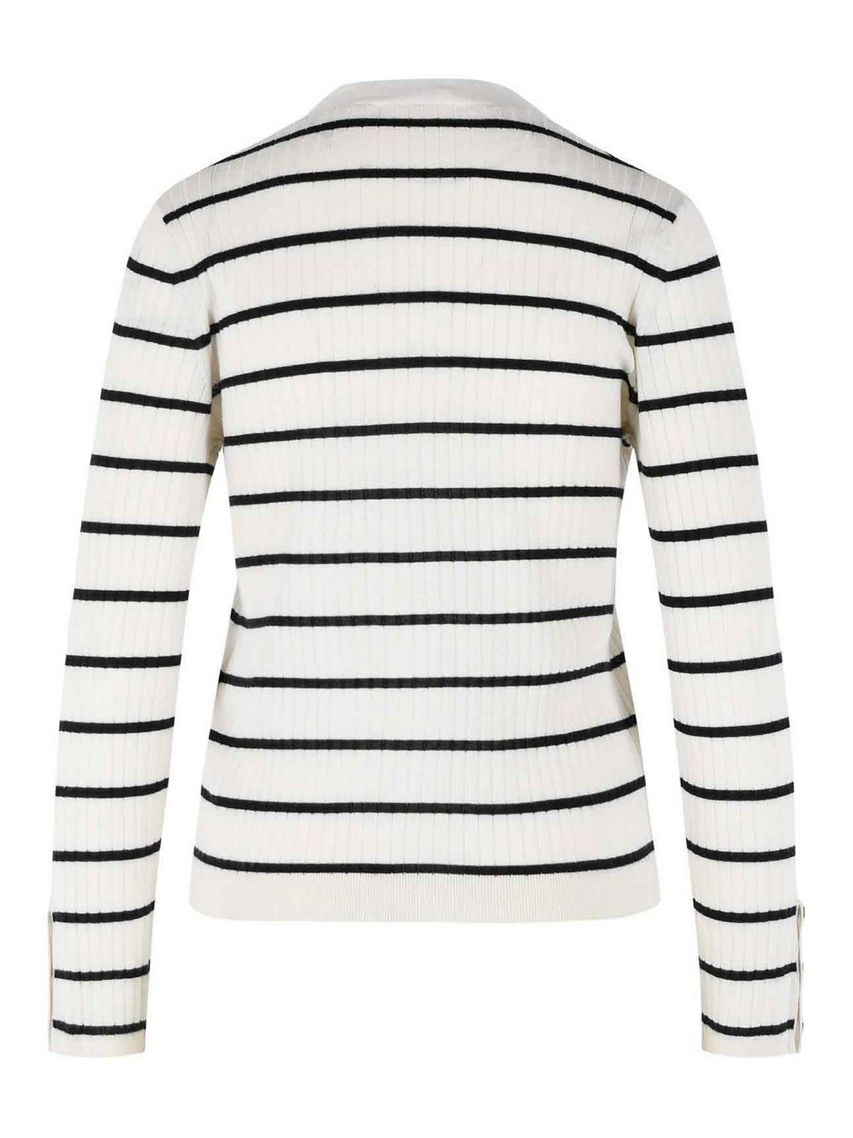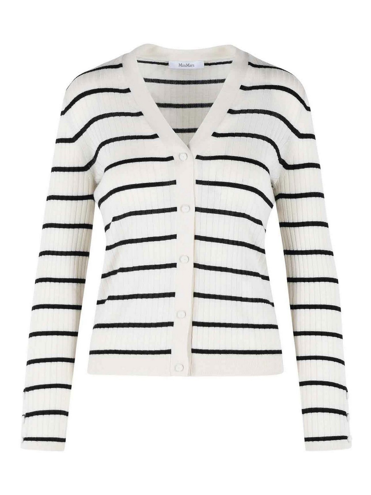 Vネック、フロントボタン留め、コントラストカラーの横縞模様、ボタンカフス、リブ編みの縁取り。