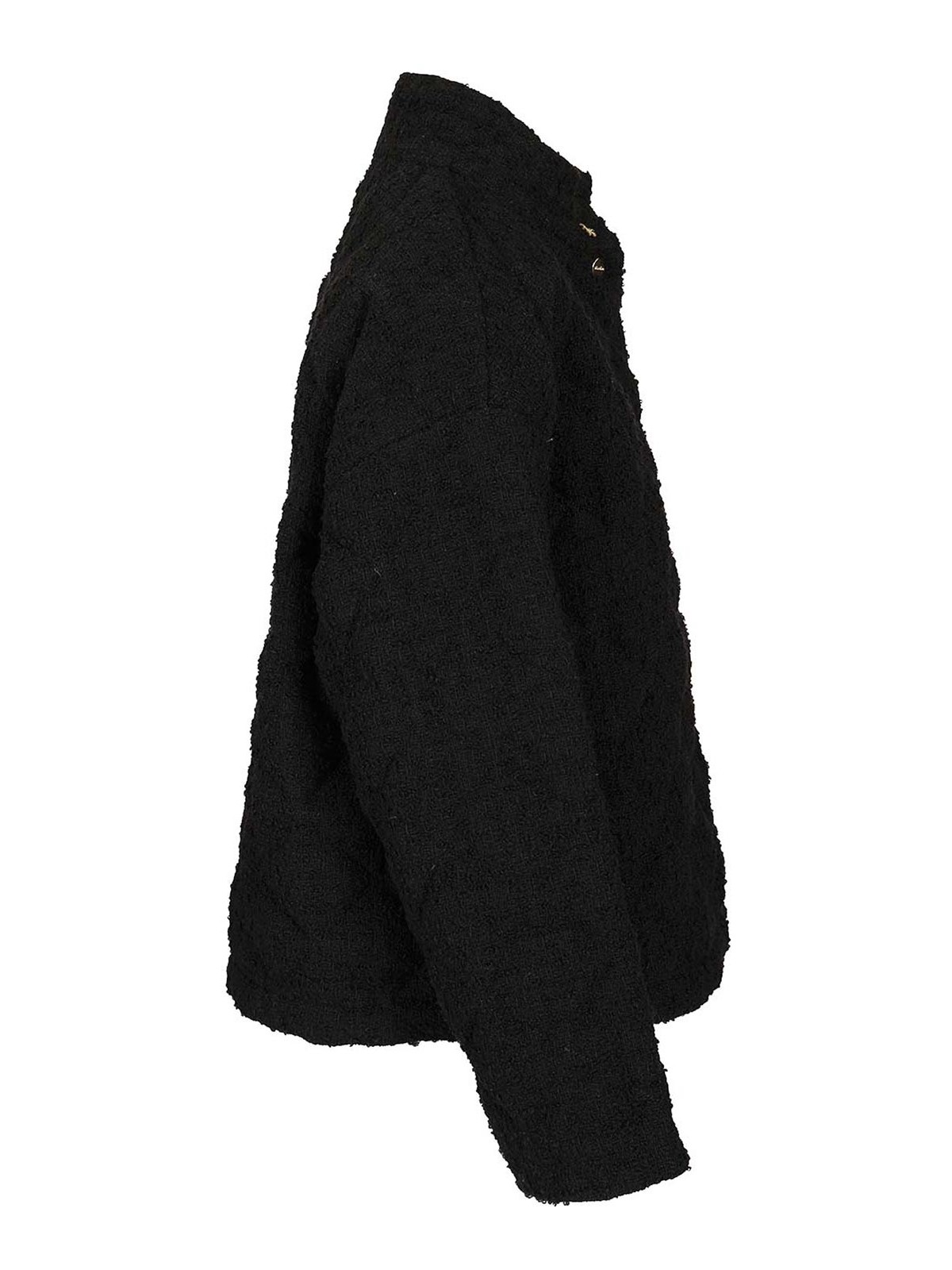 ウールとコットンのブークル混紡素材を使用したハイネックのダウンジャケット。フロントクロージャーとゴールドメタルのボタンアイコンが特徴です。