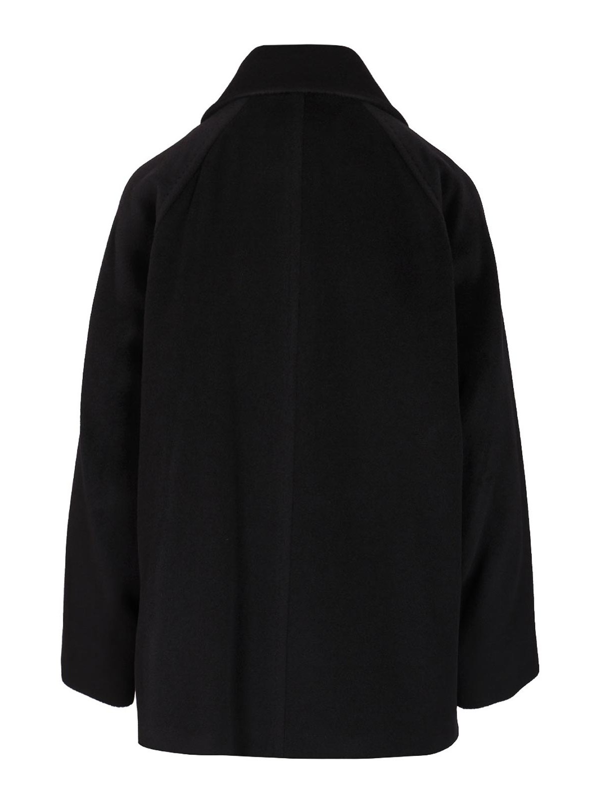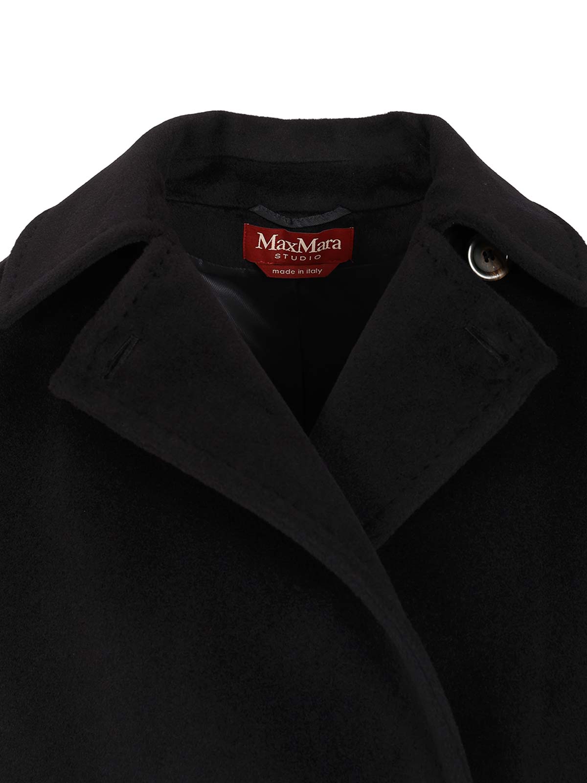 max mara studioのダブルブレストウールピーコート。ワイドラインでオーバーサイズフィット。襟元を開けてラペルで着たり、ボタンで閉めたりできる多用途な襟、幅広の着物スリーブ、2つのボタンが付いたローダブルブレストファスナー、ヒップにサイドウェルトポケット、総裏地
