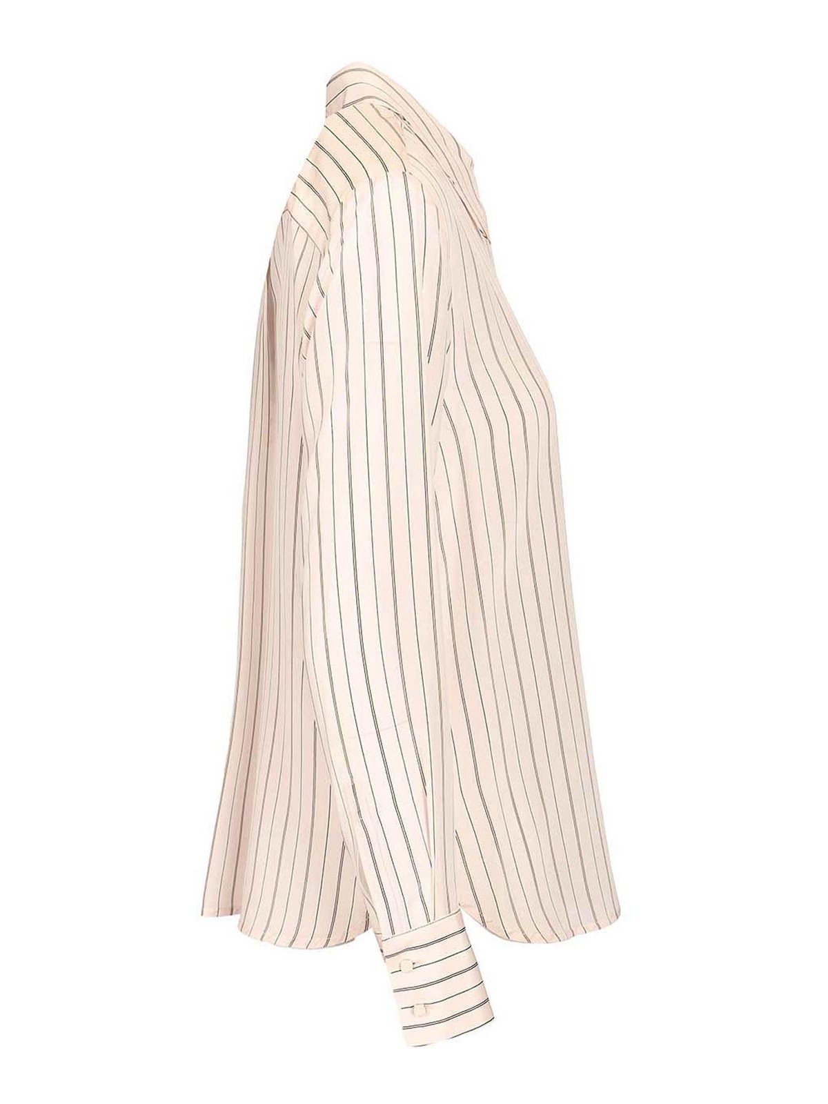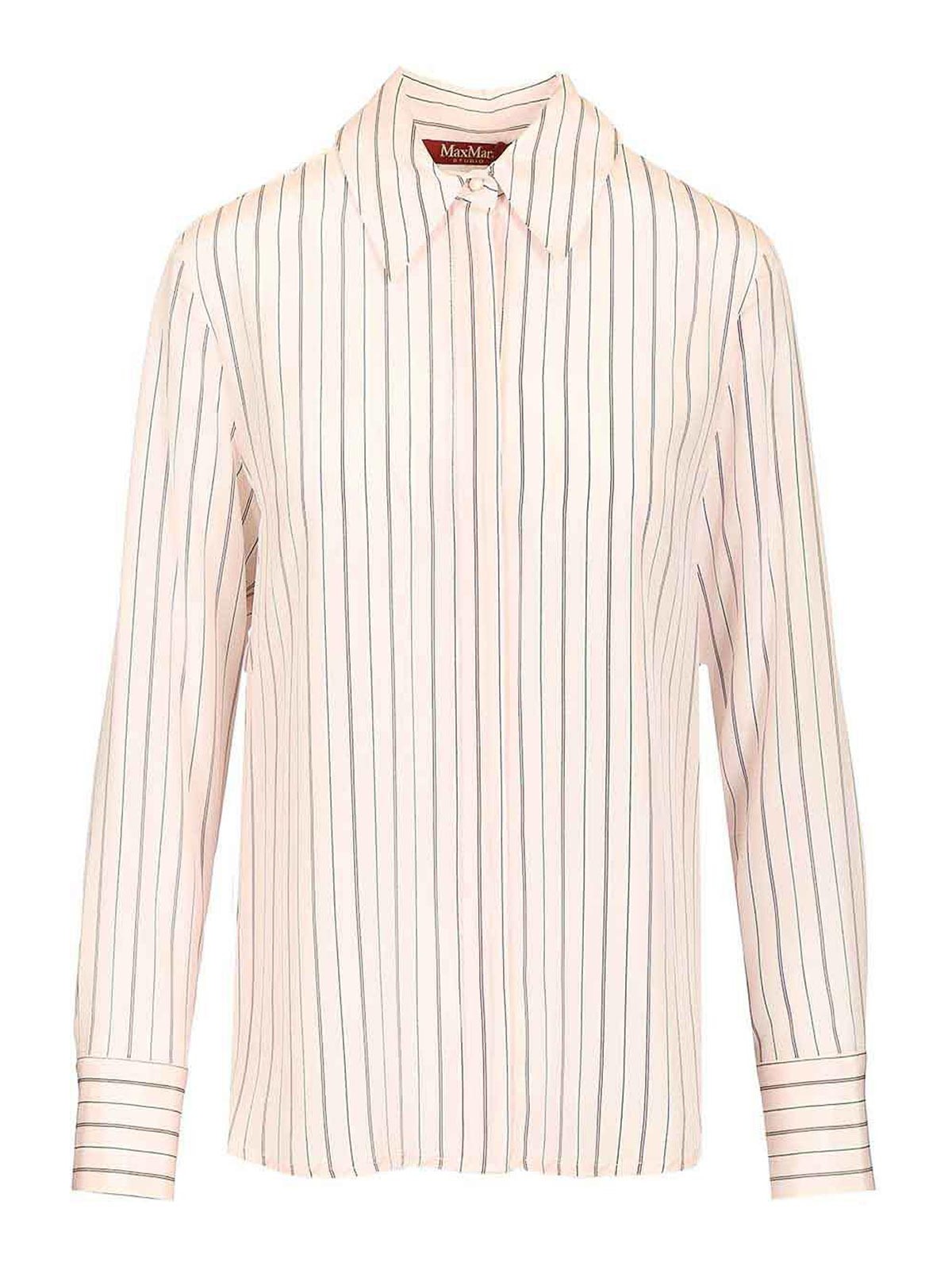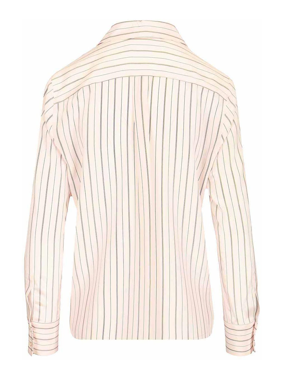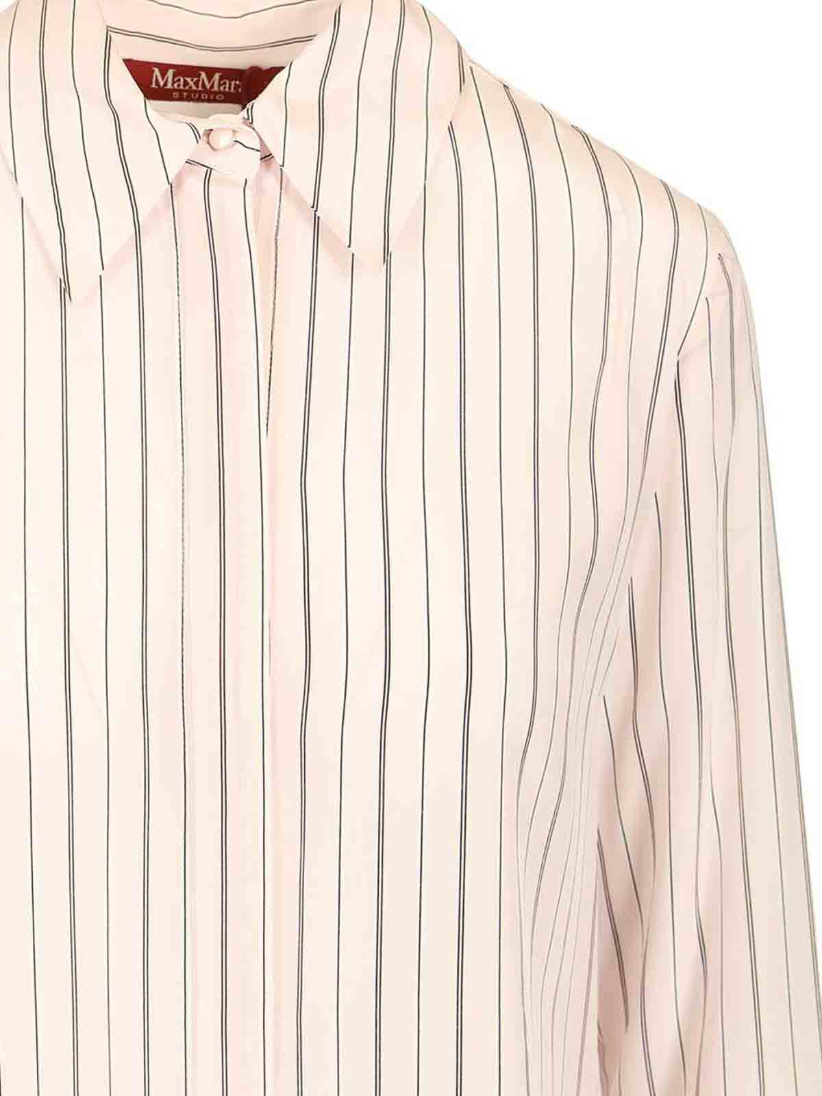 max mara studioのストライププリント入りクレープデシンシャツ。ストレートフィットのシャツカラーセット。袖口はハイカフス、ダブルエナメルボタン付きスリーブは隠しヨークカット、背中は中央にプリーツ、裾は丸みを帯びたサイドスリット入り