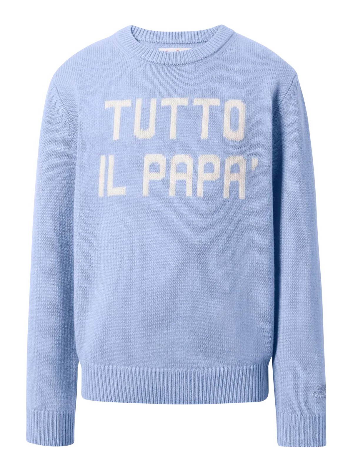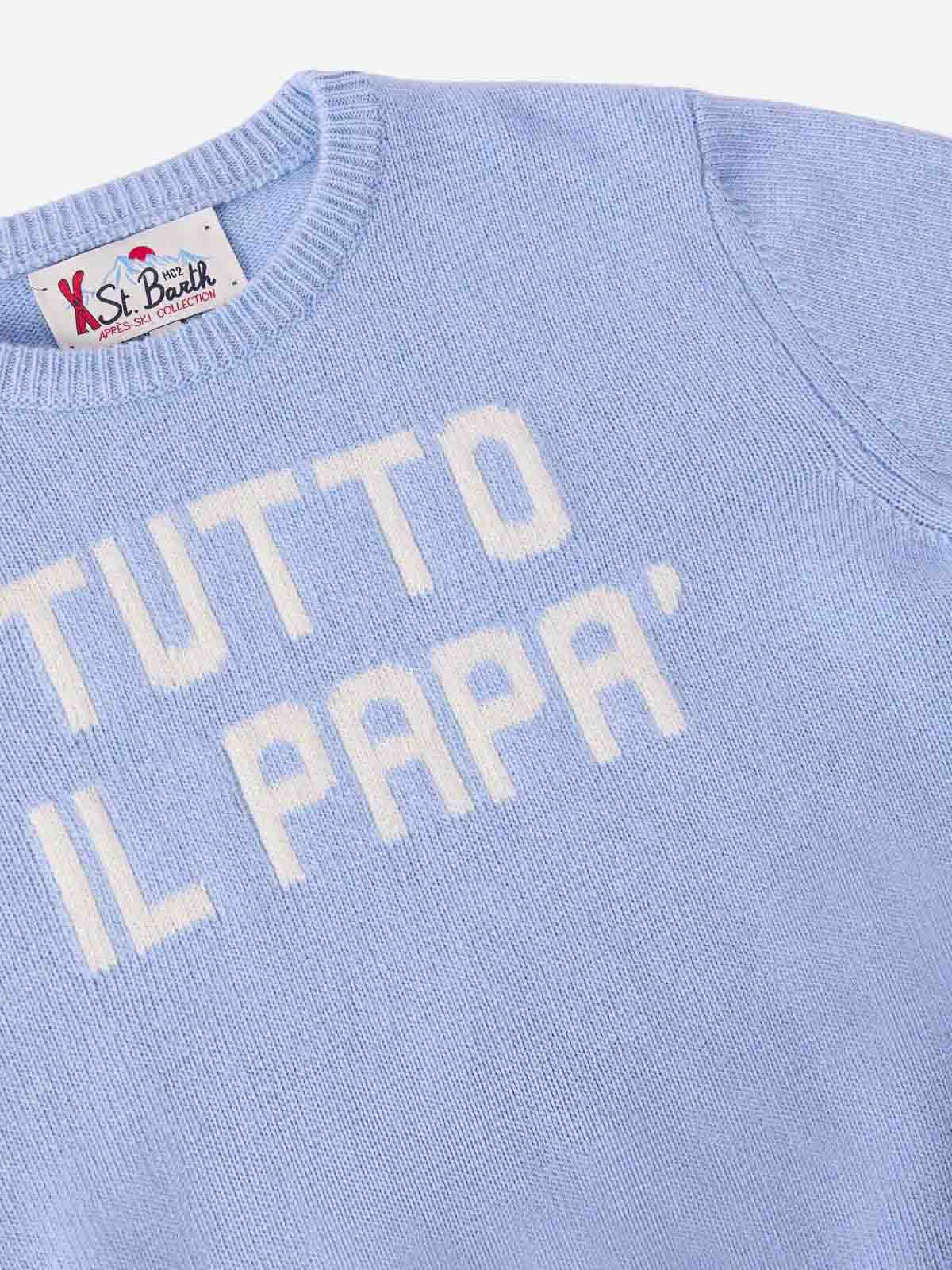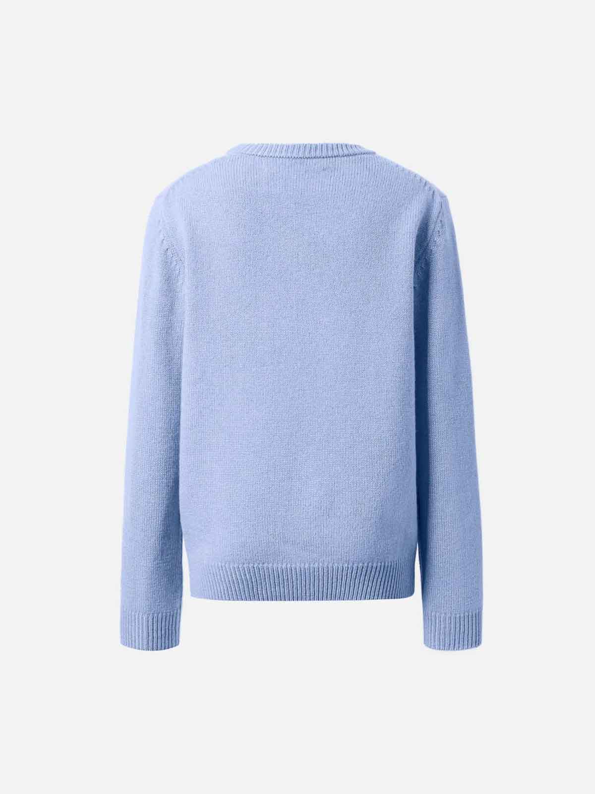 文字入りプルオーバー子供用セータークルーネック、リブ編みの襟カフス、裾のカフス、裾のカフス、無地のライトブルーのジャカードパッチ全体にSaint Barthのロゴが刺繍されています。レギュラーフィット