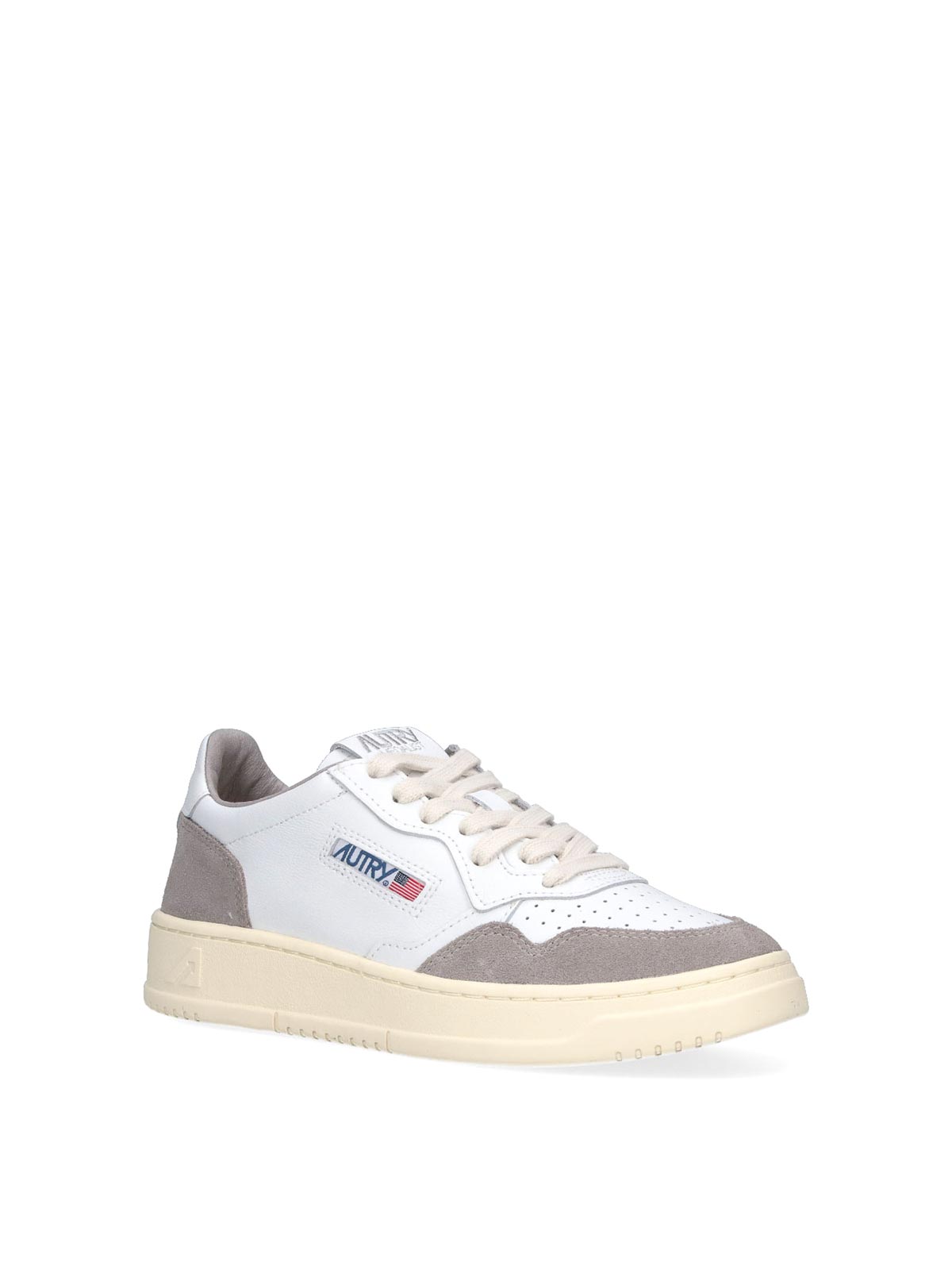 Autry ローメダリストスニーカー、ホワイトレザー、ラウンドトウ、レースクロージャー、トングロゴラベル、サイドマルチカラーロゴタグ、リアタブ、コントラストスエード仕上げ、ラバーソール。