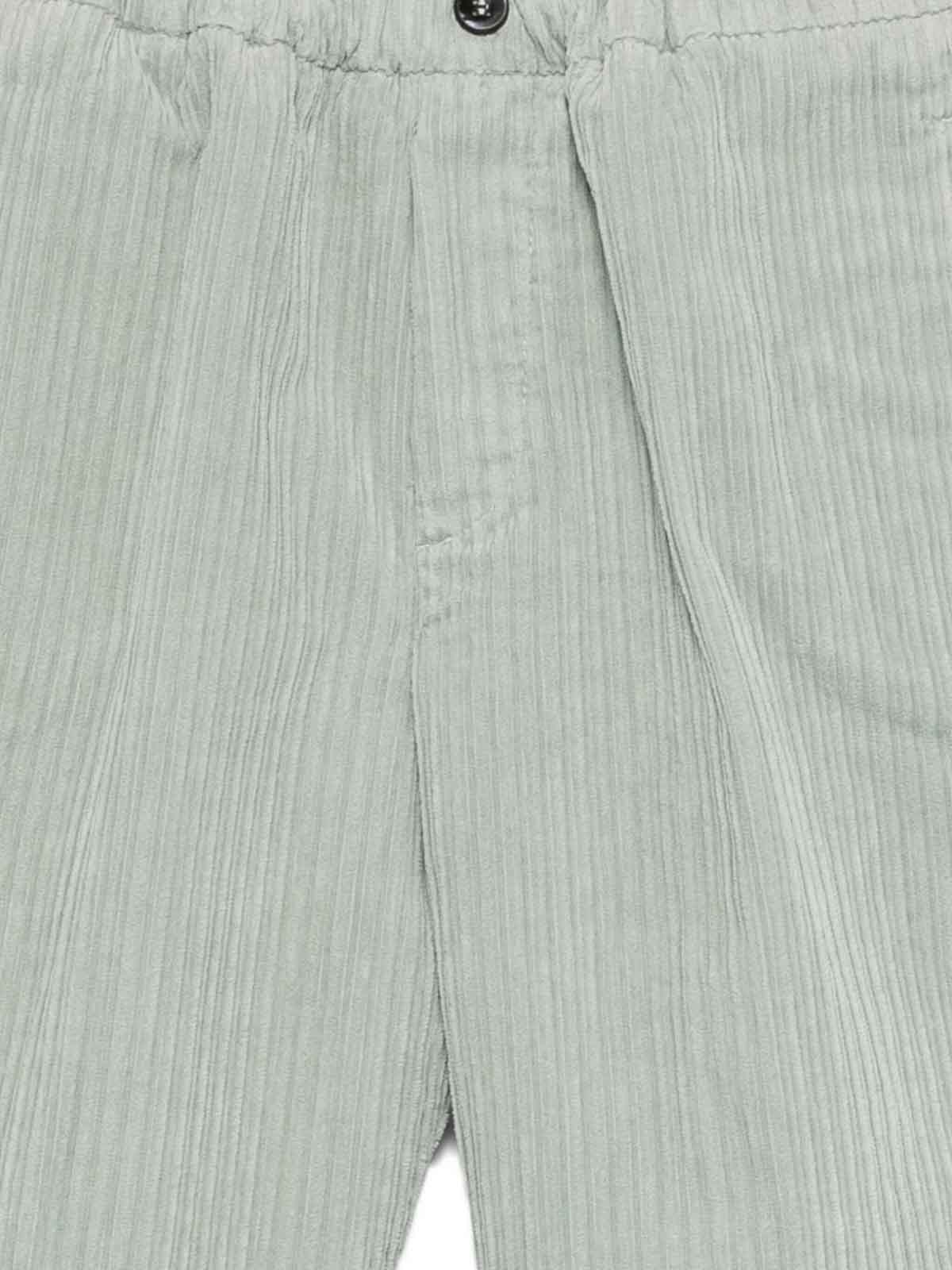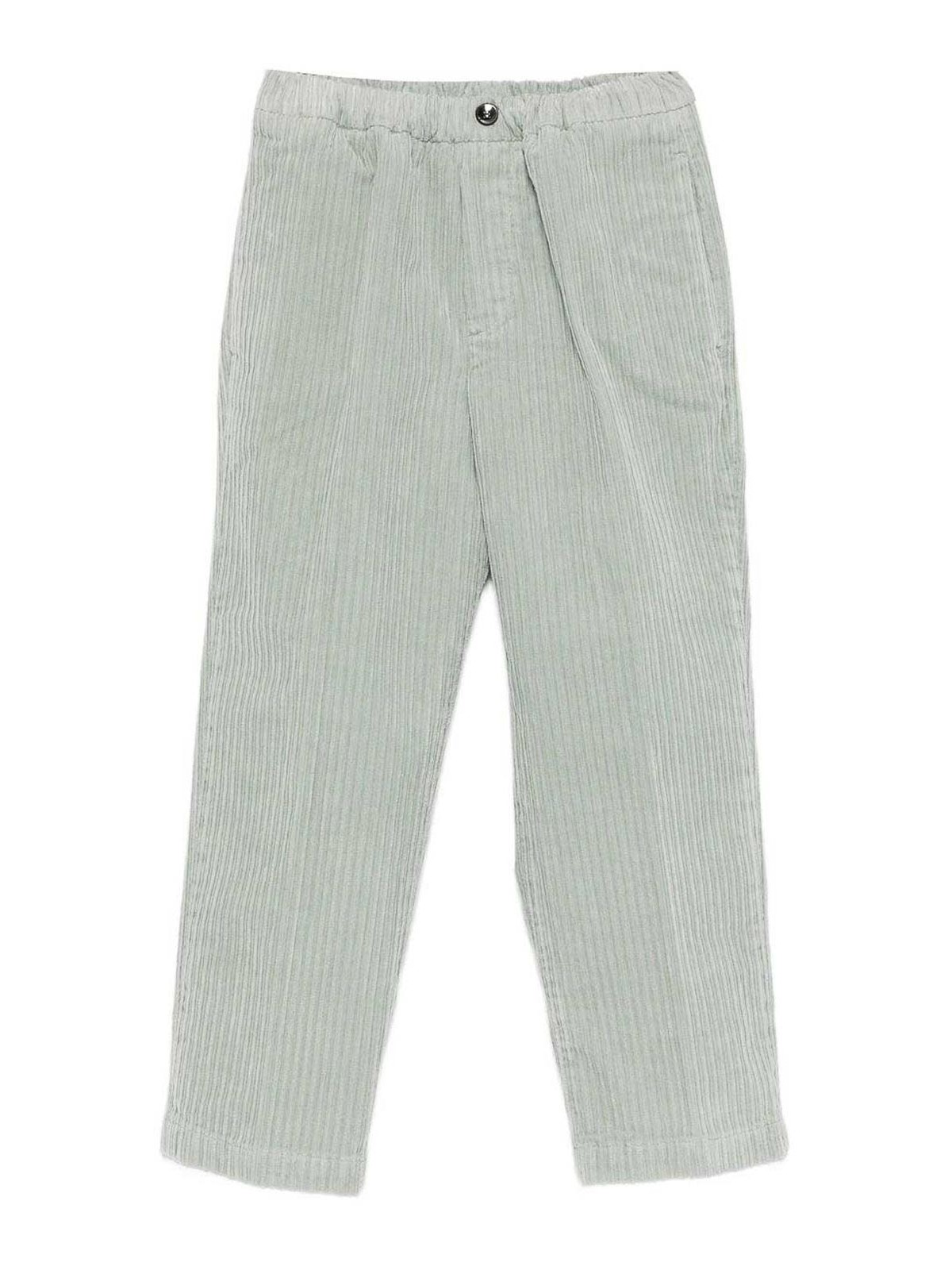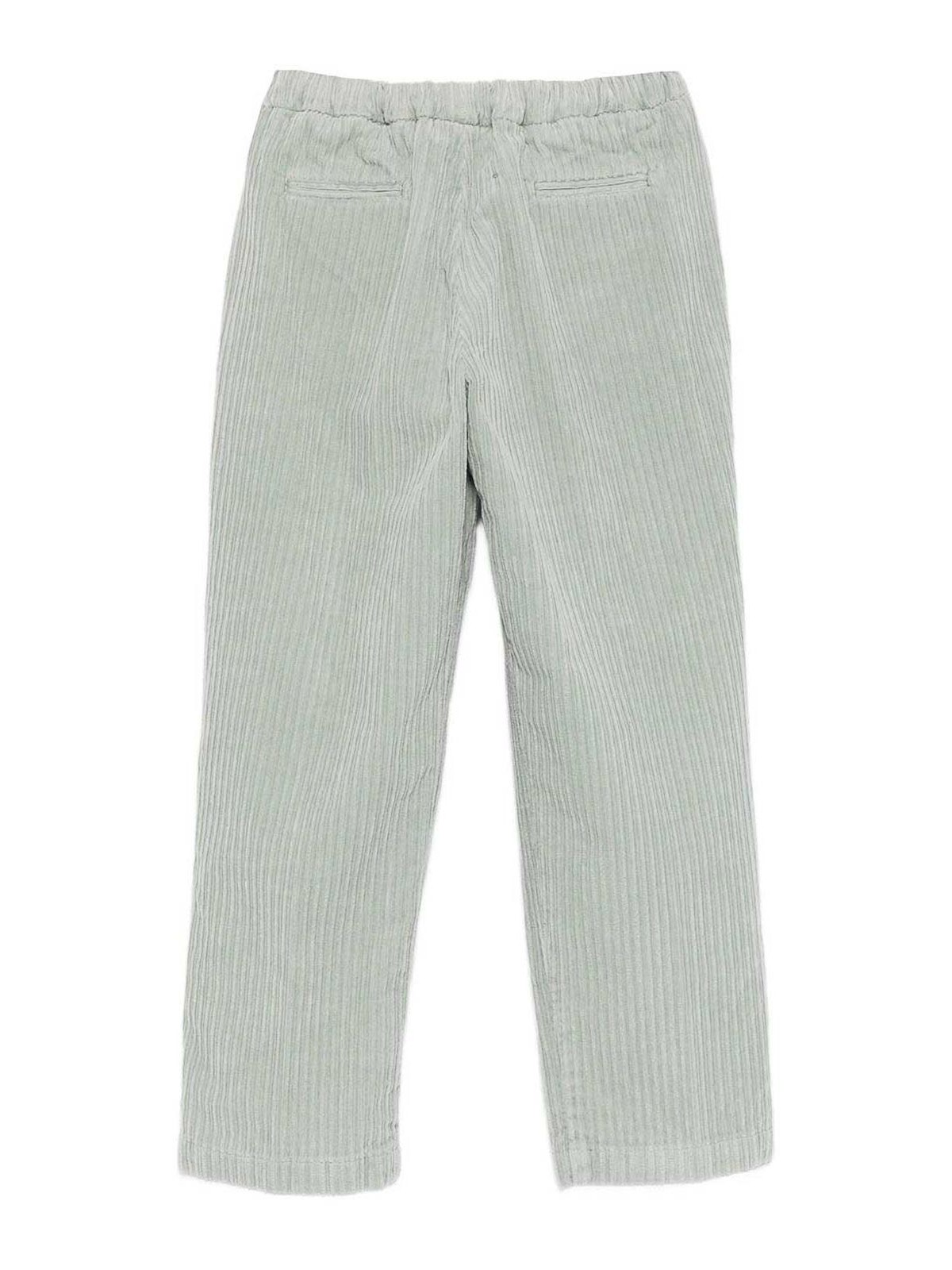 コーデュロイパンツは、緑の伸縮性ウエストバンド、隠しバックポケット、リブ付きサイドポケットが特徴です