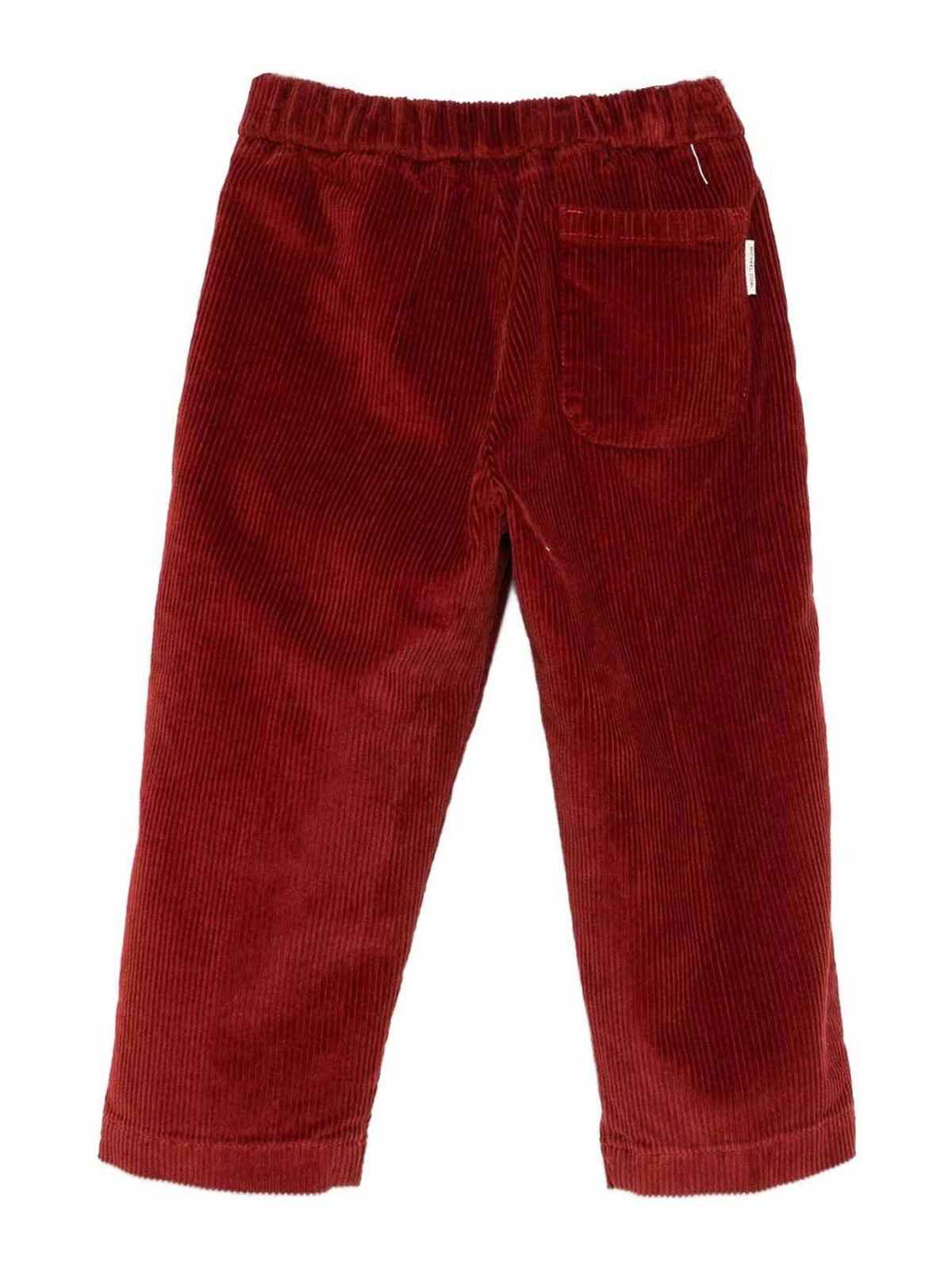 コーデュロイパンツは茶色の伸縮性ウエスト、ストレートレッグが特徴です